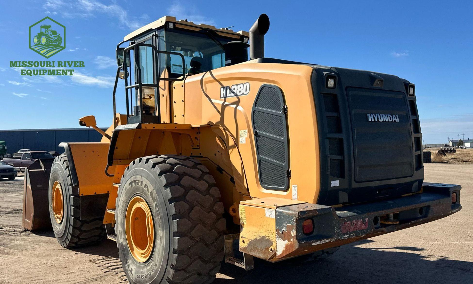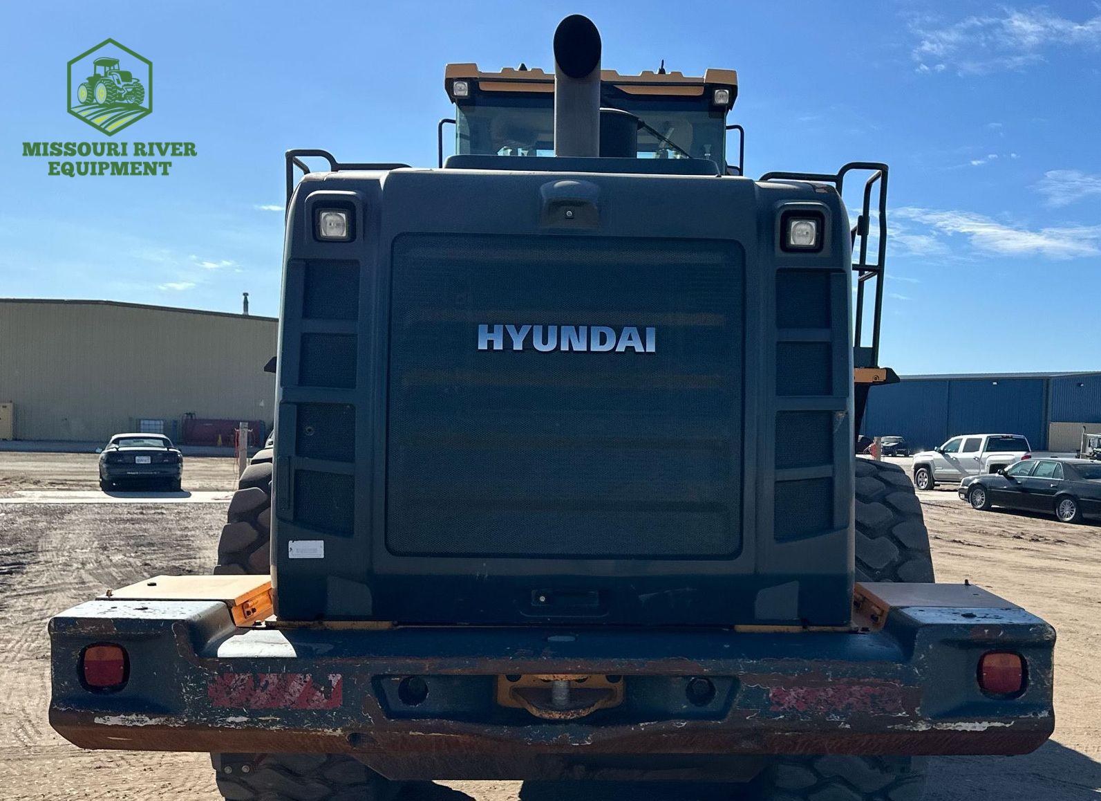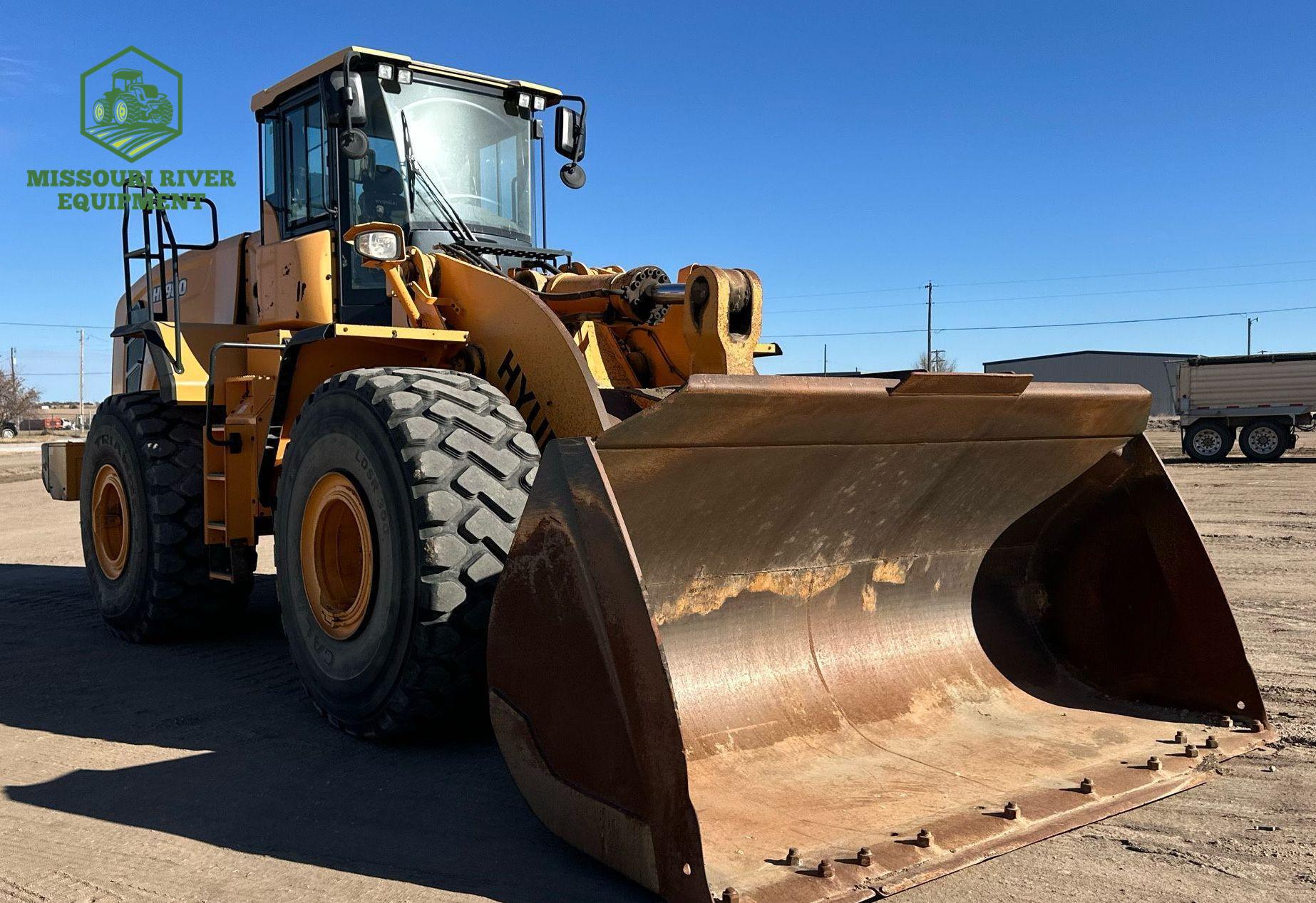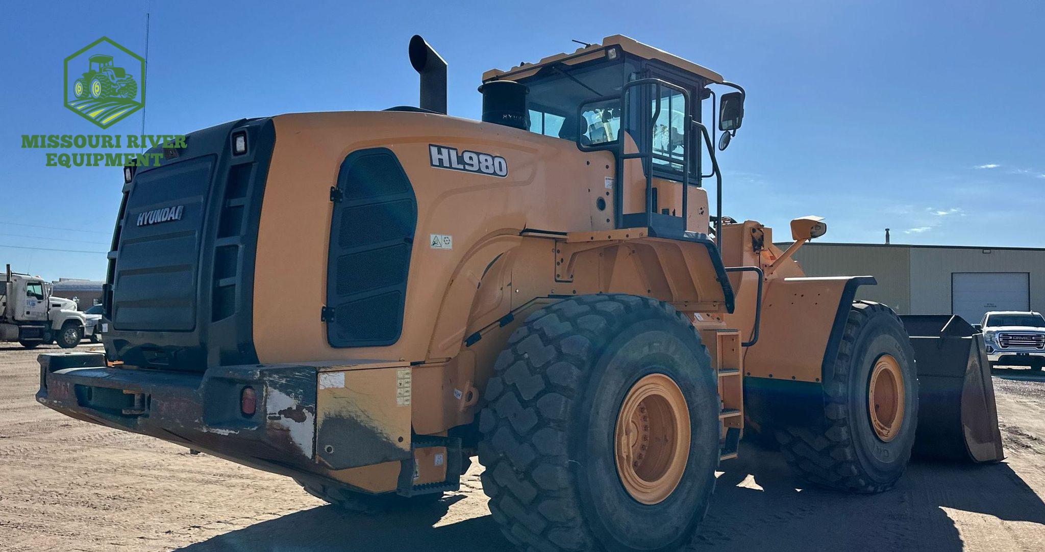 2016 Hyundai HL980 wheel loader, 13,542 hours on meter. Powered by a 6-cylinder diesel engine with powershift transmission (4 forward / 3 reverse). Operator station features enclosed cab with AC and heat. Includes counterweights and 135" self-leveling bucket with bolt-on cutting edge. Riding on 29.5R25 tires. Part of a group extension with associated items ER8438, ER8439, and ER8440.