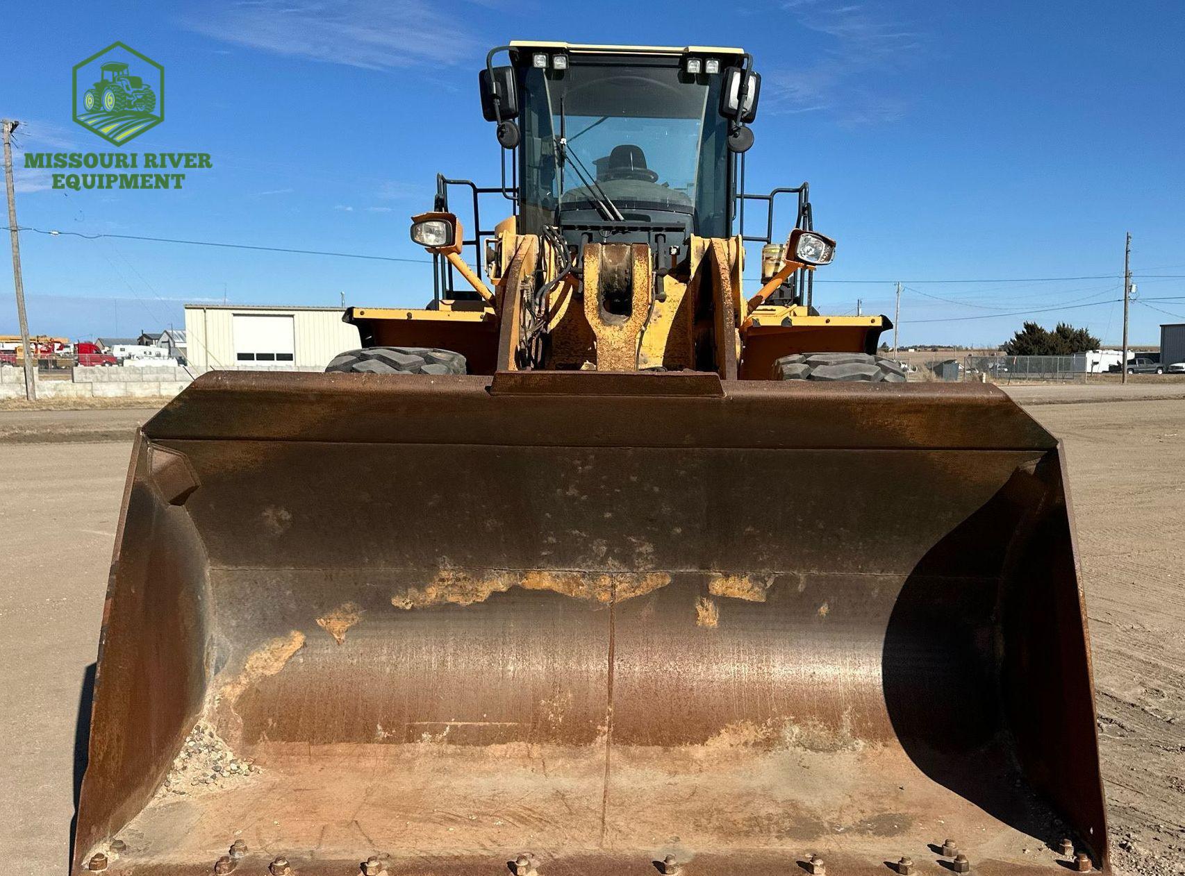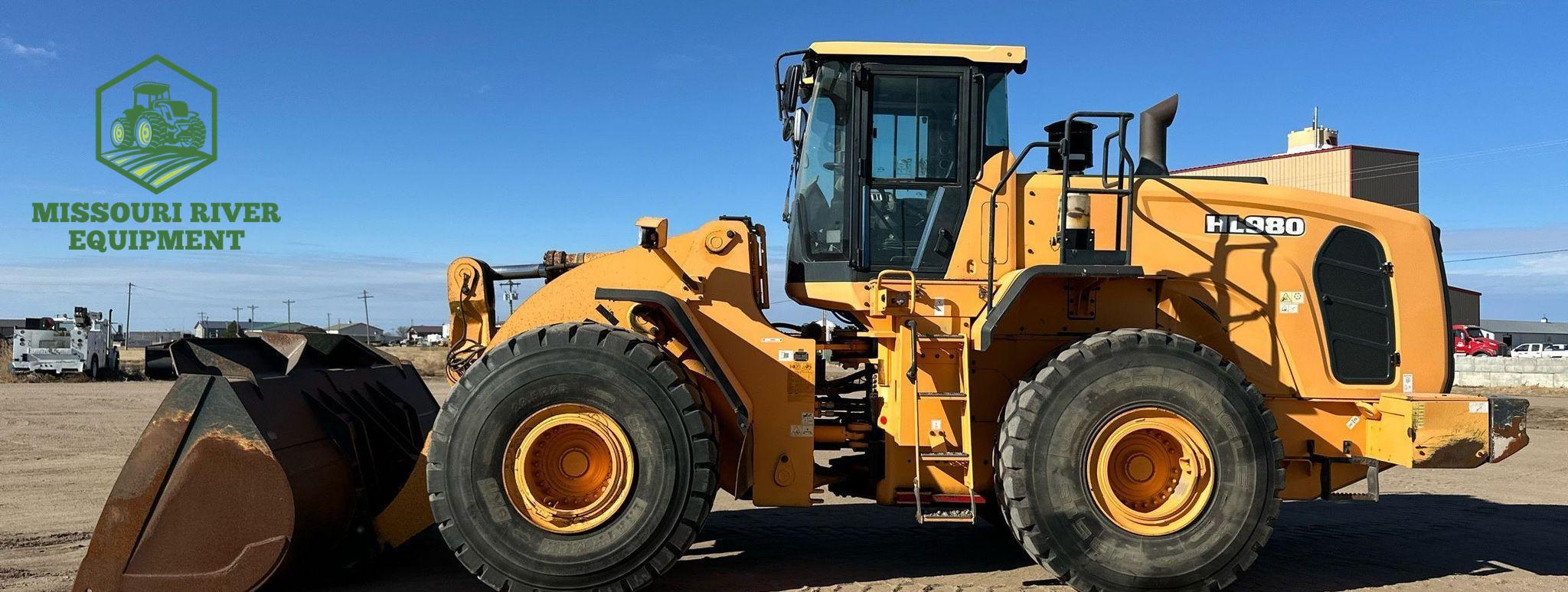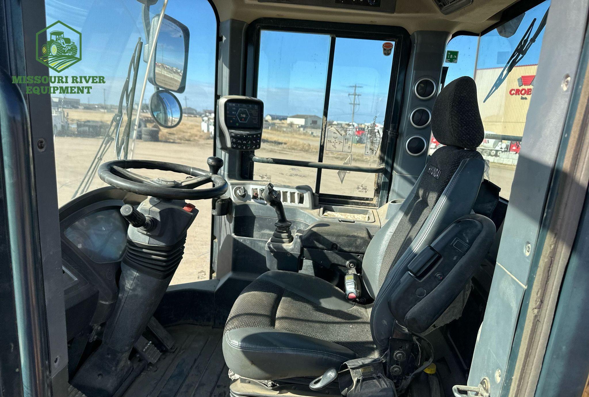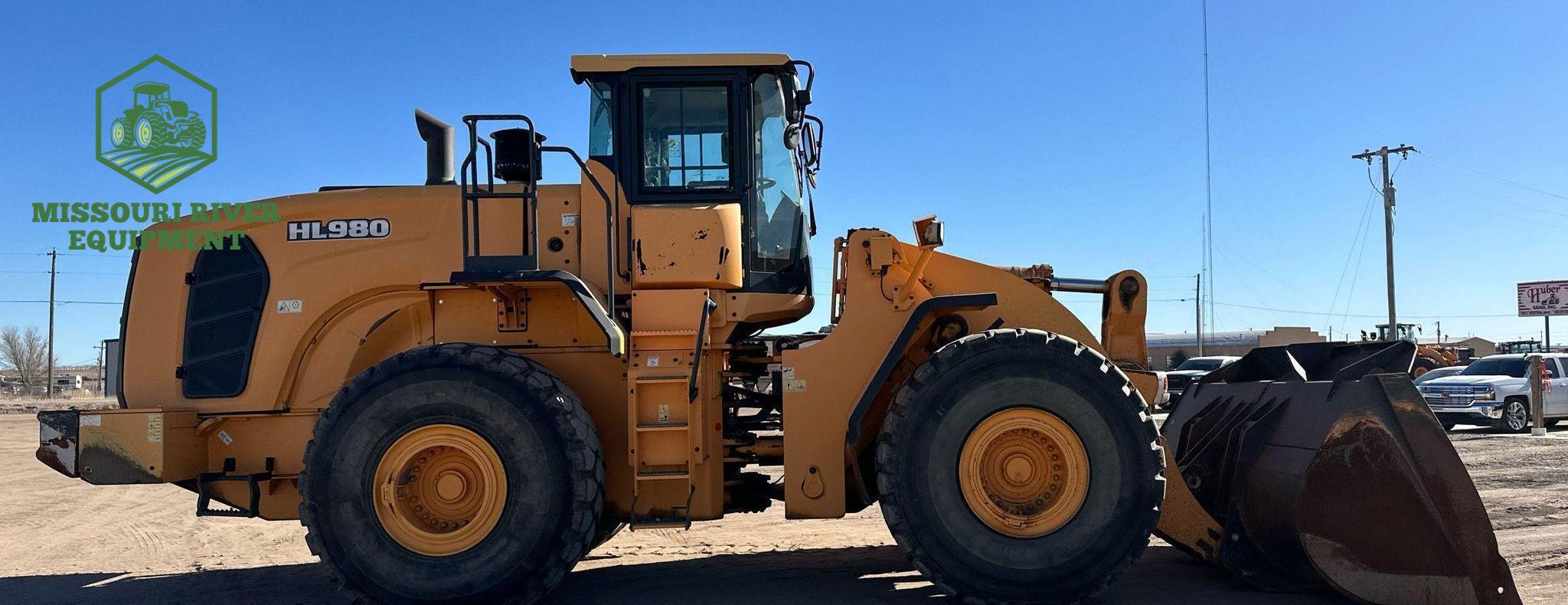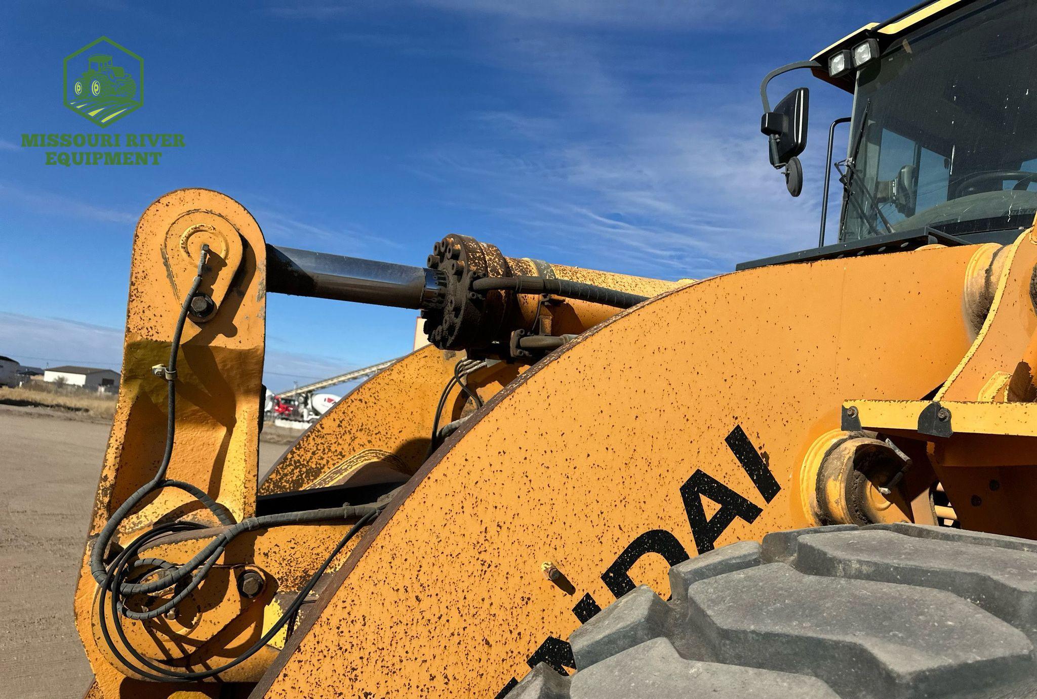 2016 Hyundai HL980 wheel loader, 13,542 hours on meter. Powered by a 6-cylinder diesel engine with powershift transmission (4 forward / 3 reverse). Operator station features enclosed cab with AC and heat. Includes counterweights and 135" self-leveling bucket with bolt-on cutting edge. Riding on 29.5R25 tires. Part of a group extension with associated items ER8438, ER8439, and ER8440.