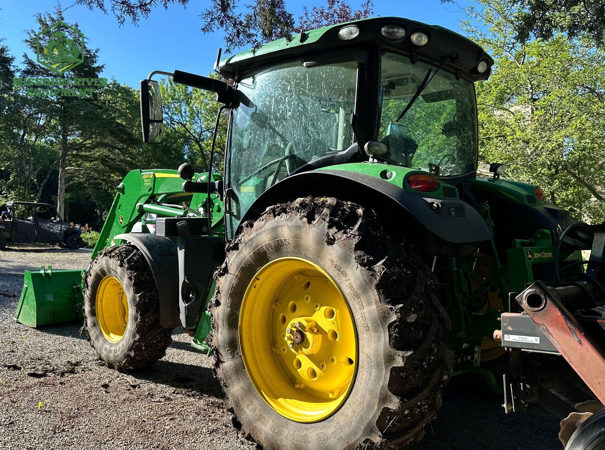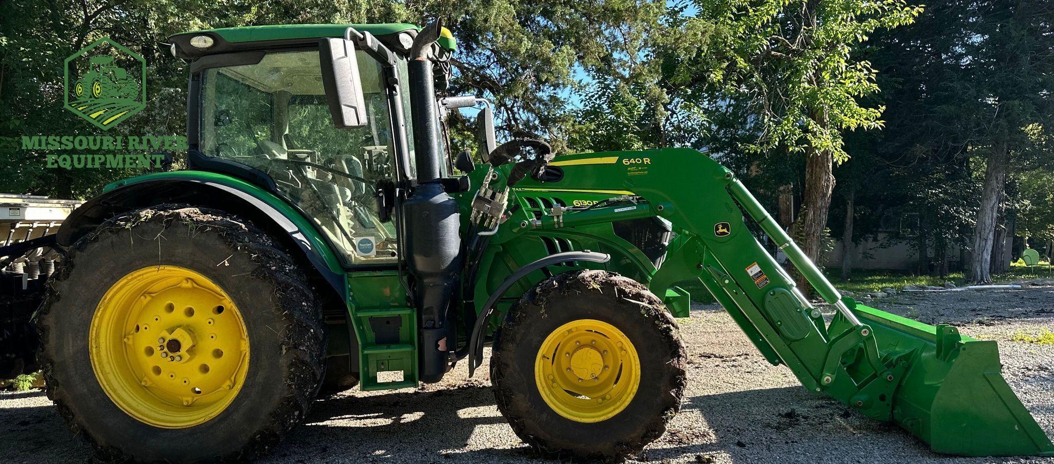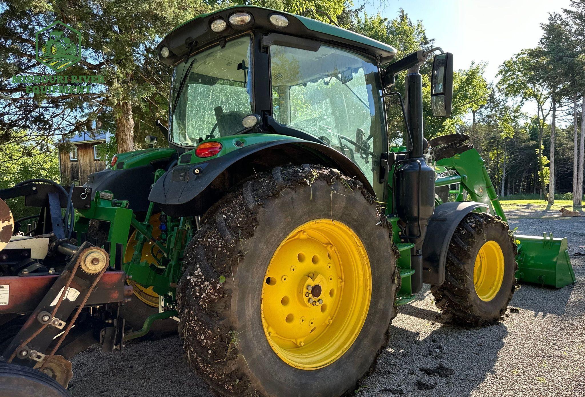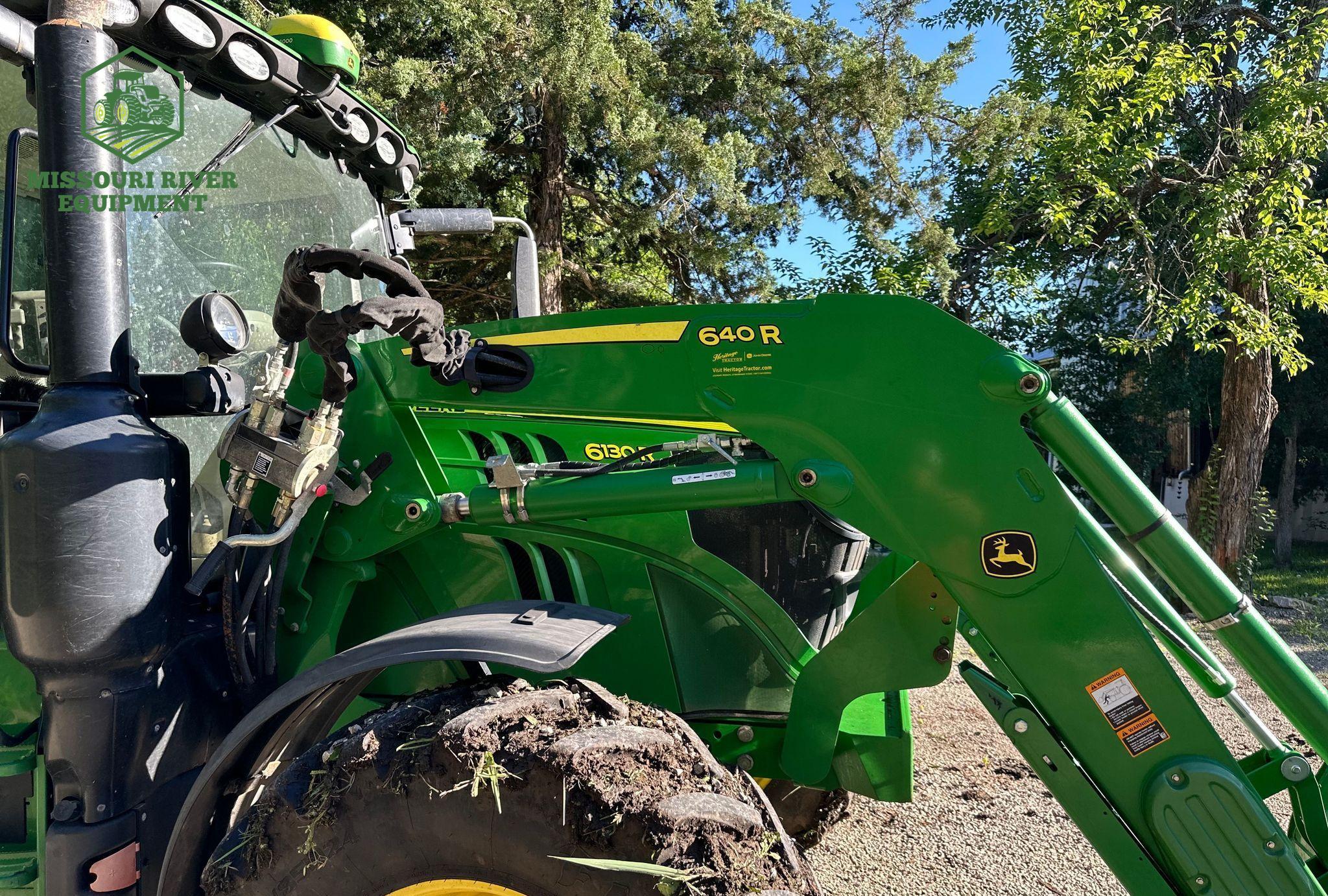 2016 John Deere 6130R MFWD tractor, 1,745 hours on meter. Powered by a John Deere 4.5L 4-Cylinder Diesel Engine rated at 130 HP, paired with a powershift transmission (24 forward / 24 reverse) and left-hand reverser. Equipped with differential lock chassis and operator station featuring AC, heat, John Deere Starfire GPS receiver, John Deere display, and John Deere Autotrac 300 auto steer. Includes 1000 PTO, three-point hitch with quick attach and top link, seven-pin outlet, and three rear hydraulic remote sets. Comes with John Deere 640R quick attach loader with joystick controls and 87" bucket. Riding on 380/85R24 front and 460/85R38 rear tires.
