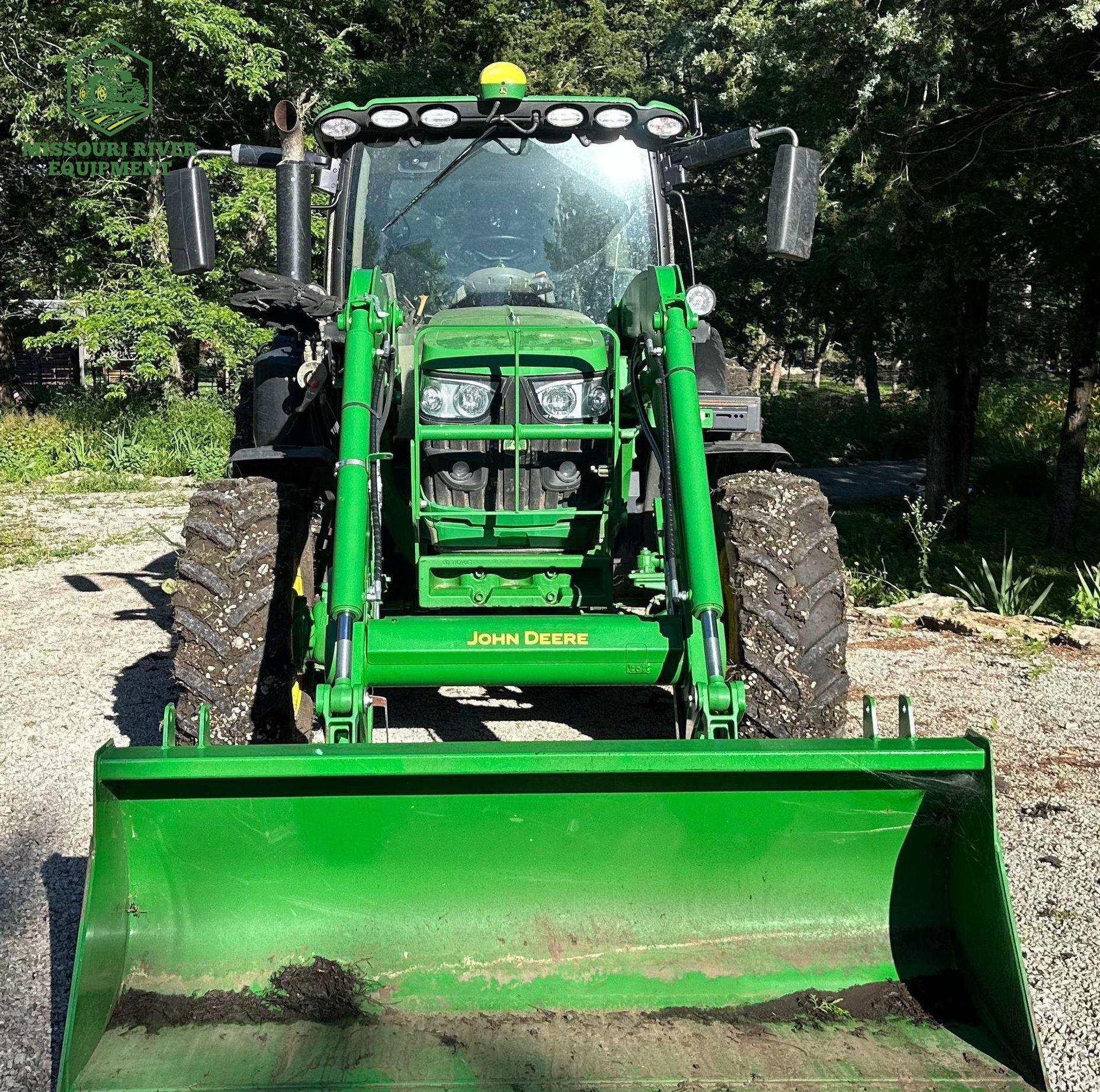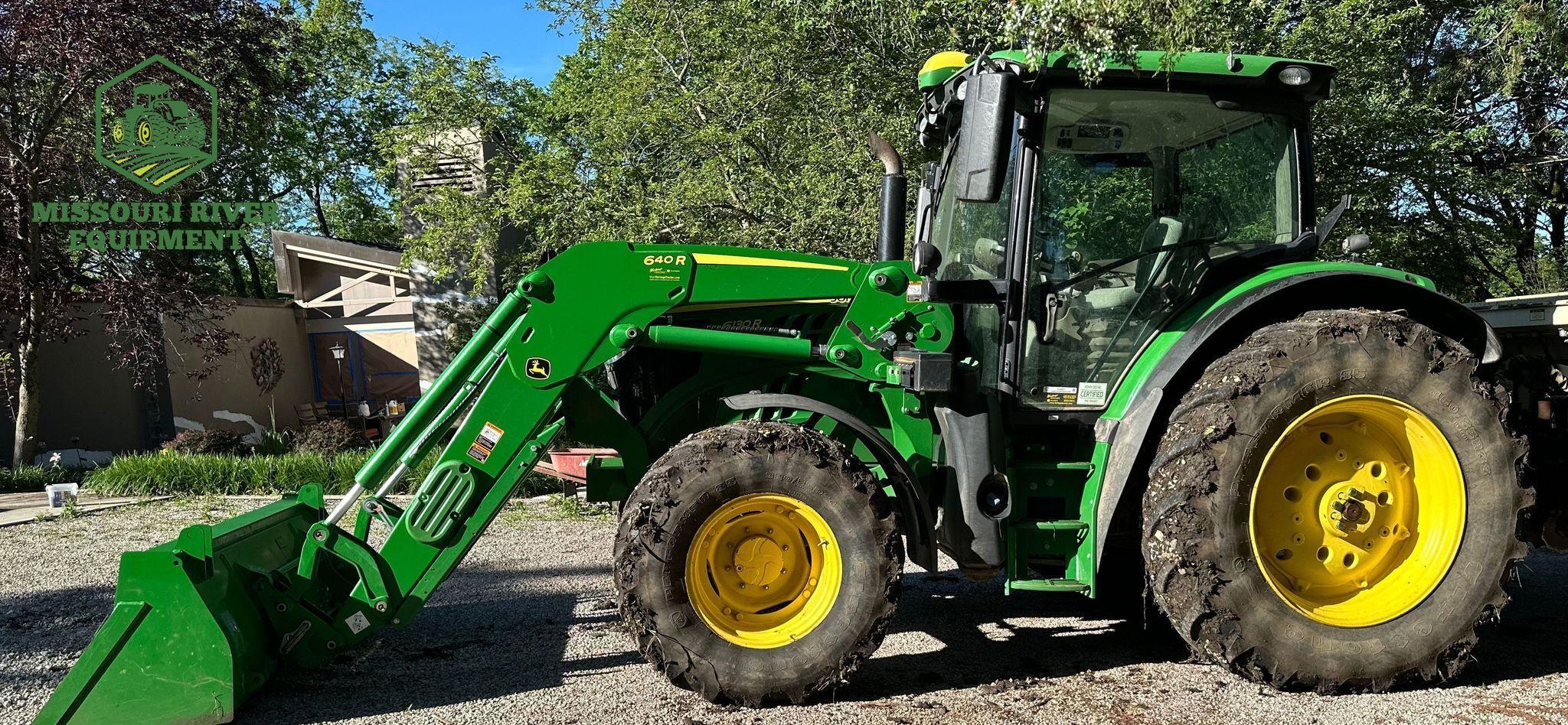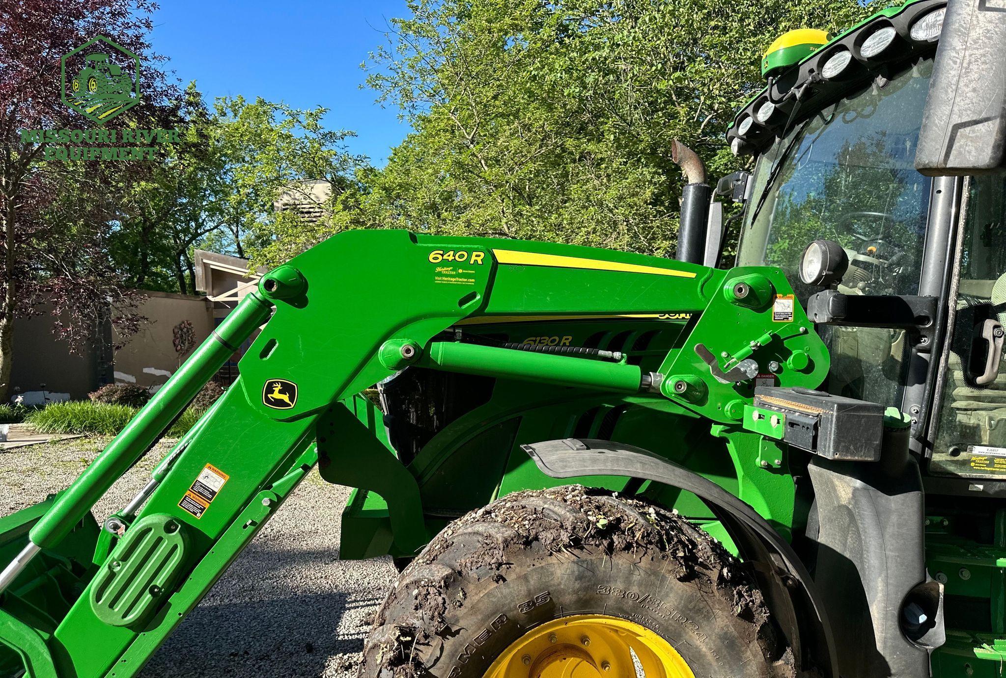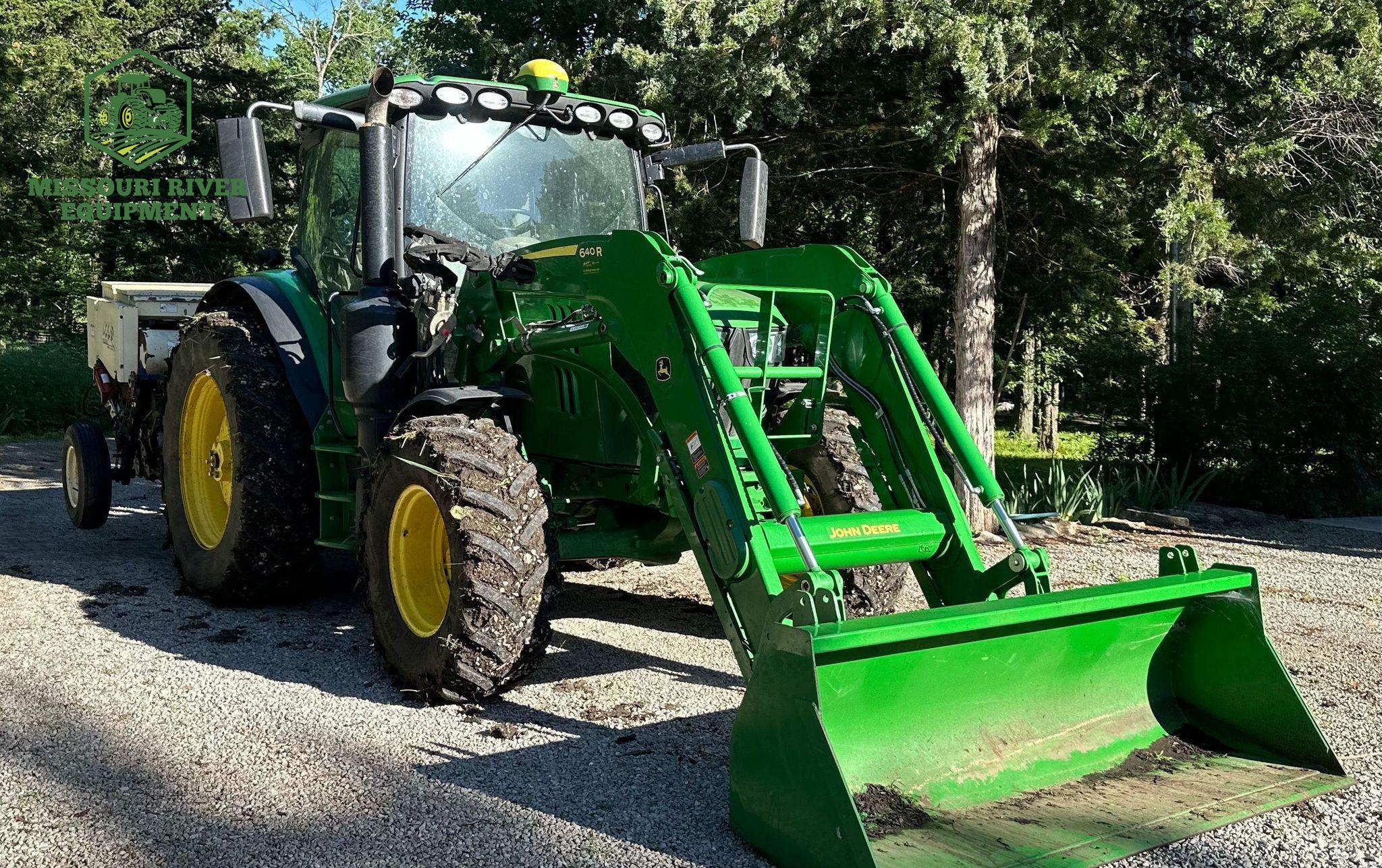 2016 John Deere 6130R MFWD tractor, 1,745 hours on meter. Powered by a John Deere 4.5L 4-Cylinder Diesel Engine rated at 130 HP, paired with a powershift transmission (24 forward / 24 reverse) and left-hand reverser. Equipped with differential lock chassis and operator station featuring AC, heat, John Deere Starfire GPS receiver, John Deere display, and John Deere Autotrac 300 auto steer. Includes 1000 PTO, three-point hitch with quick attach and top link, seven-pin outlet, and three rear hydraulic remote sets. Comes with John Deere 640R quick attach loader with joystick controls and 87" bucket. Riding on 380/85R24 front and 460/85R38 rear tires.