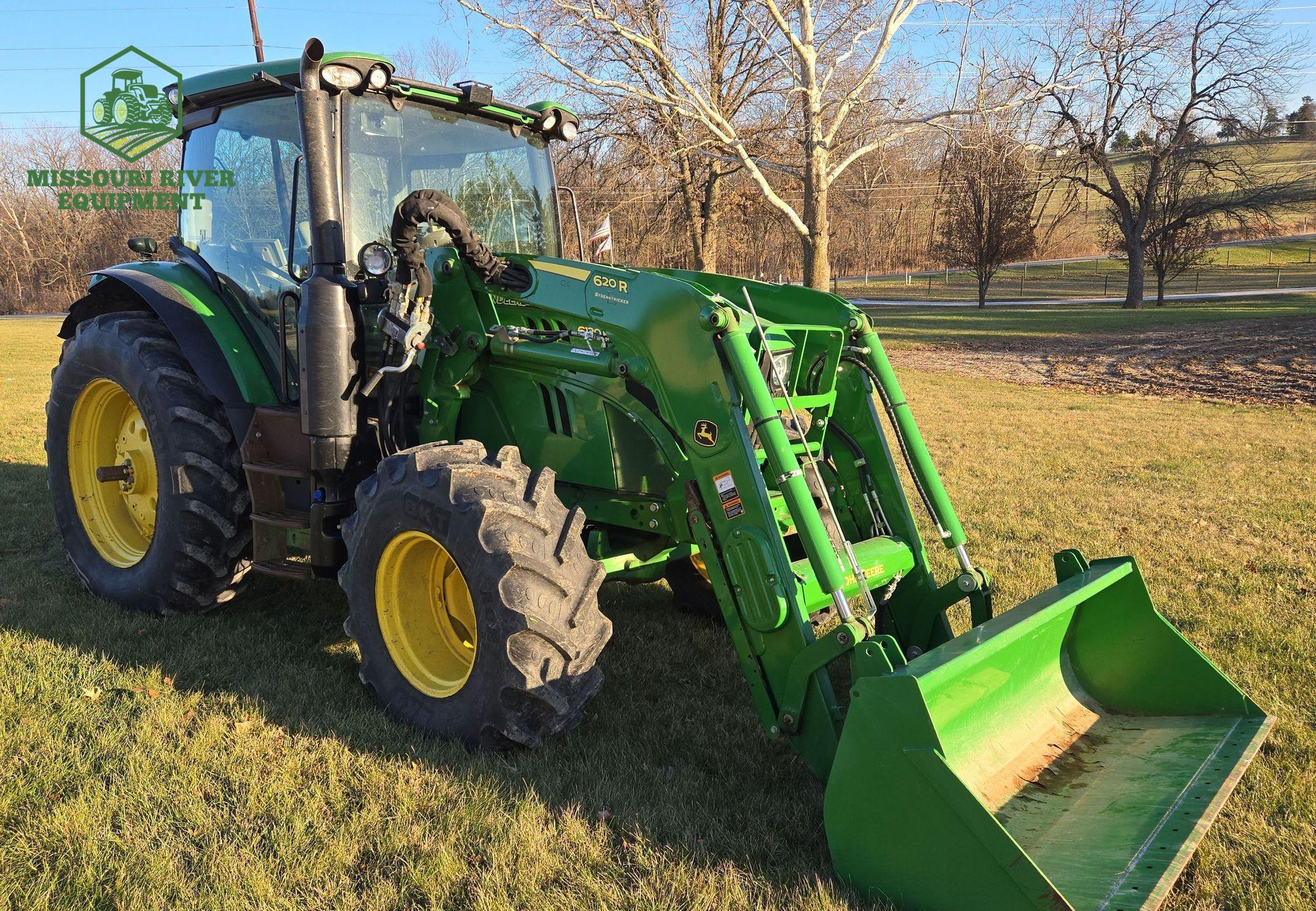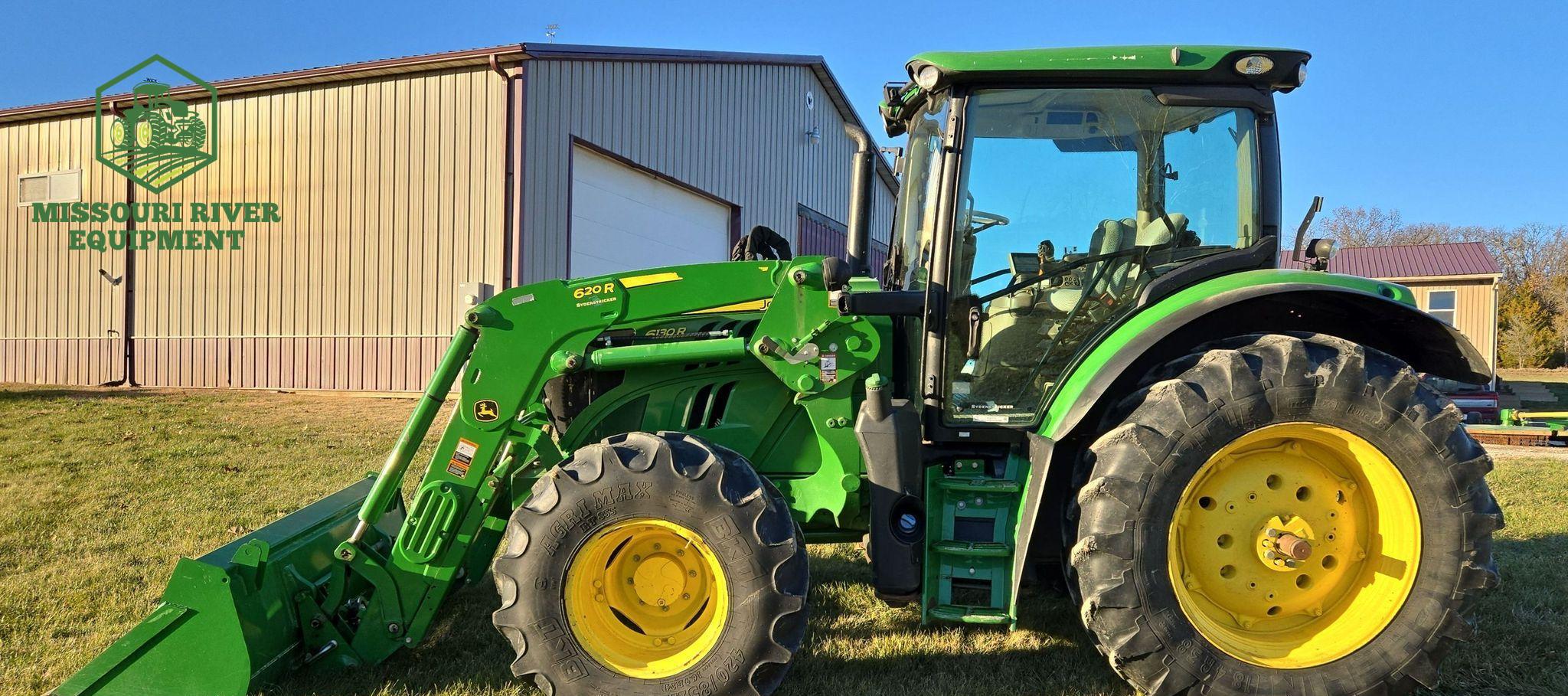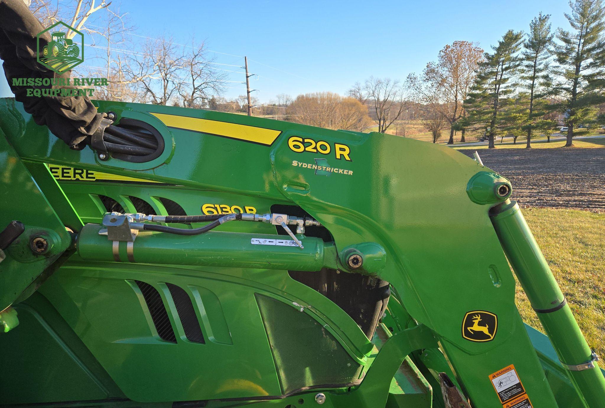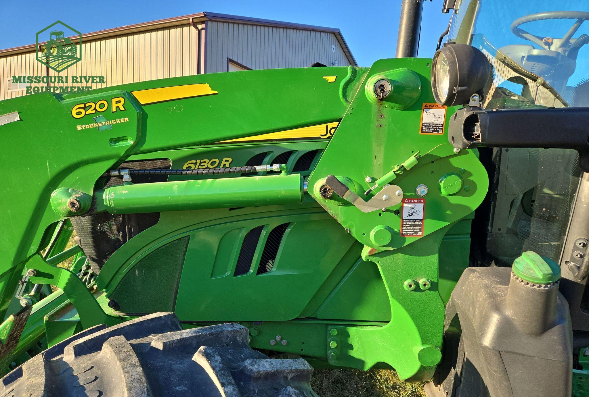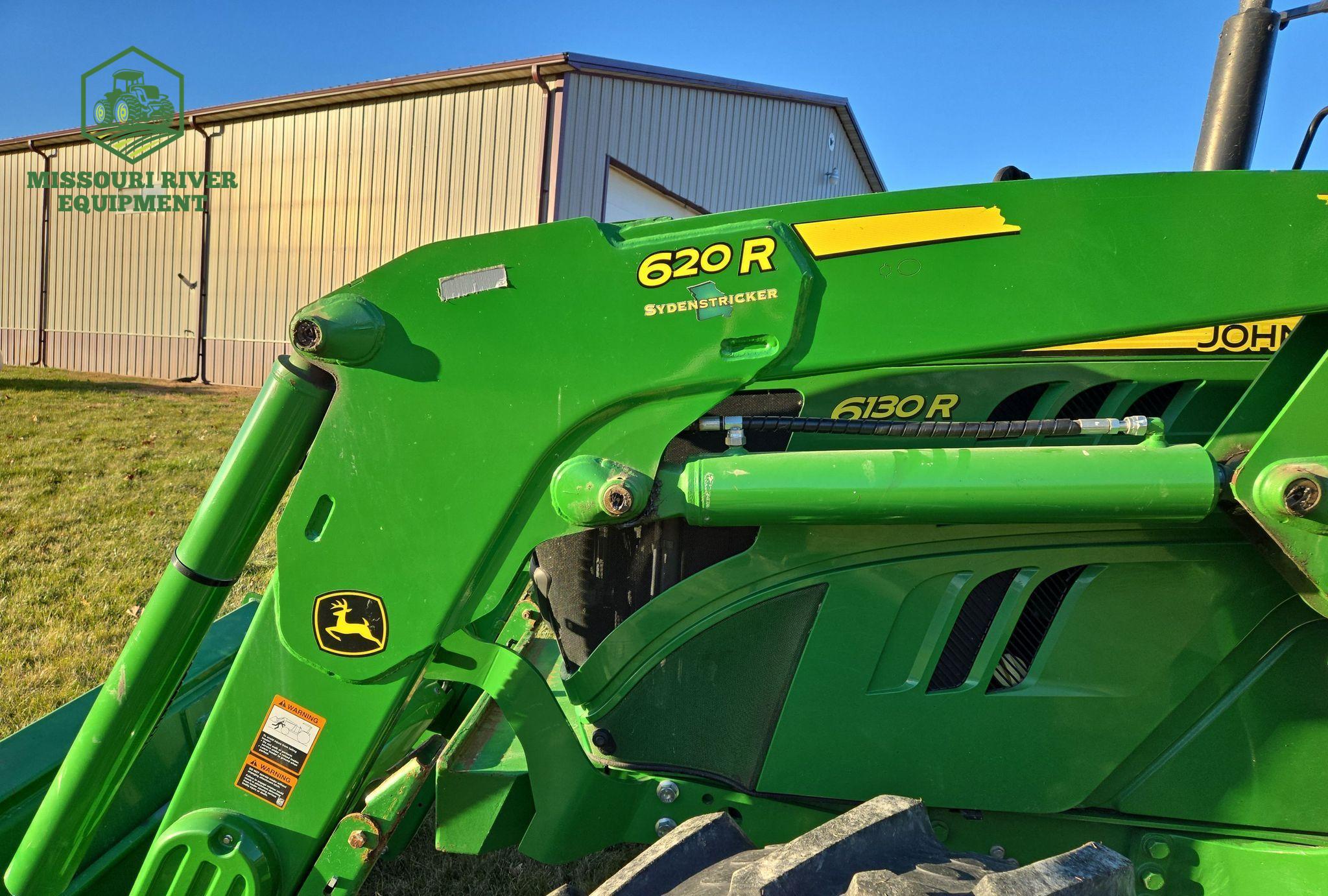 2017 John Deere 6130R MFWD tractor, 2,658 hours on meter. Powered by a John Deere 4.5L 4-Cylinder Diesel Engine (Serial: CD4045U054477) paired with powershift transmission (24 forward / 24 reverse) and differential lock. Operator station equipped with AC and heat. Features 1000 PTO, three-point hitch with top link, seven-pin outlet, and three rear hydraulic remote sets. Includes John Deere 620R quick attach loader with joystick controls and 85" bucket. Riding on 420/85R24 front and 460/85R38 rear tires. Three-point arms included.