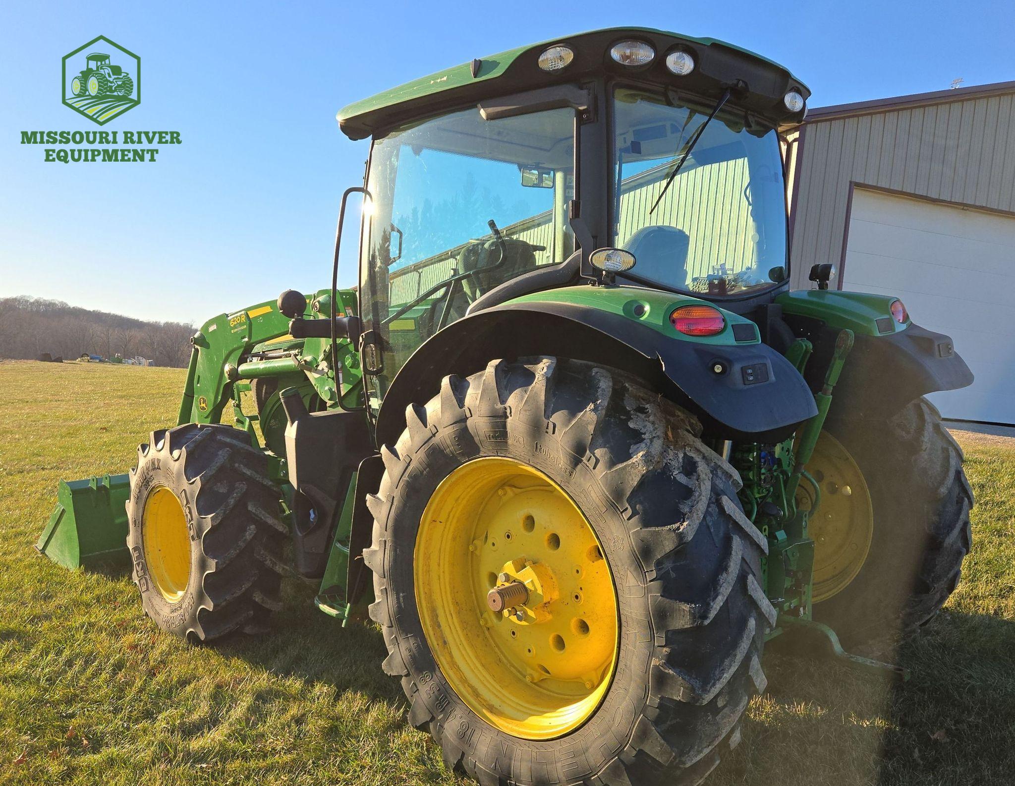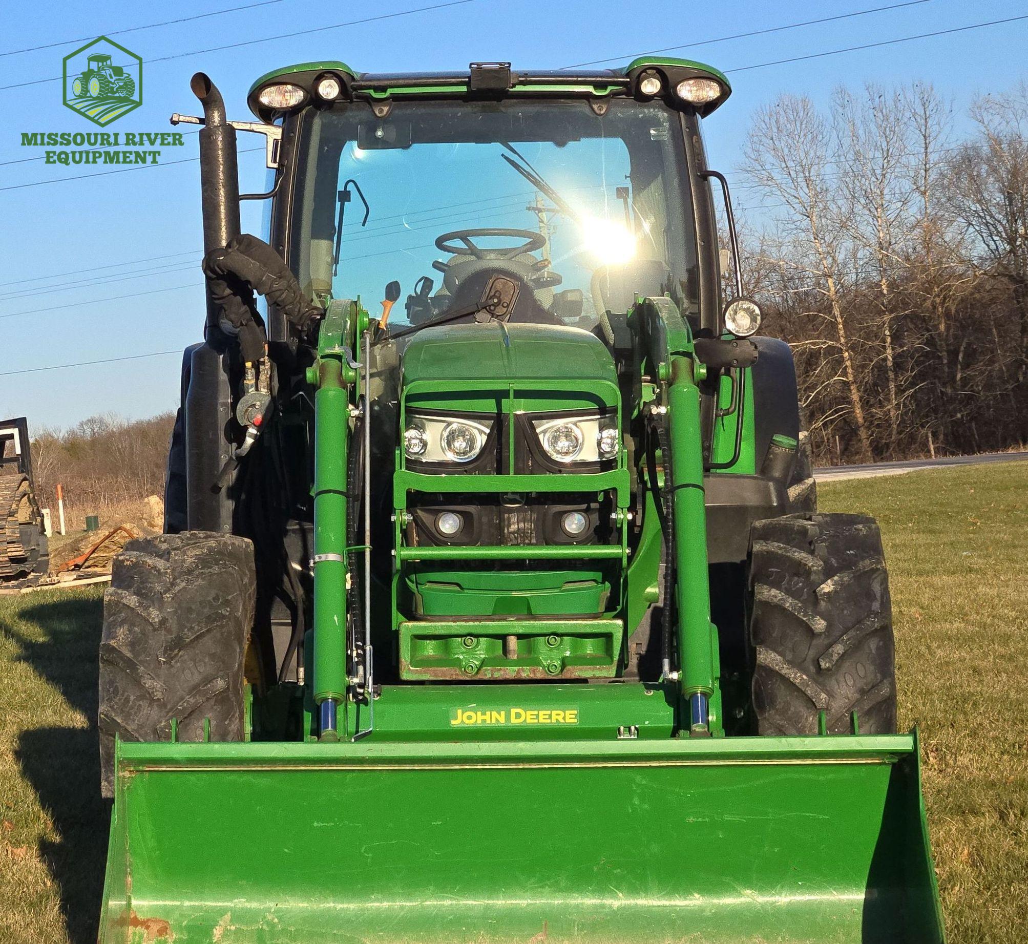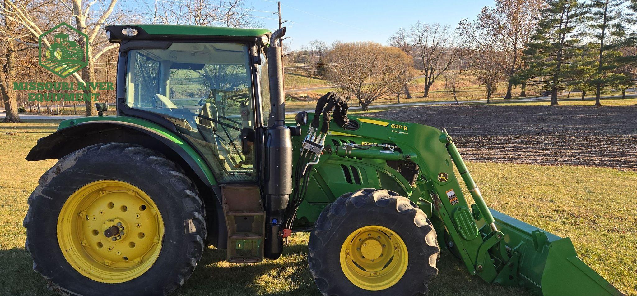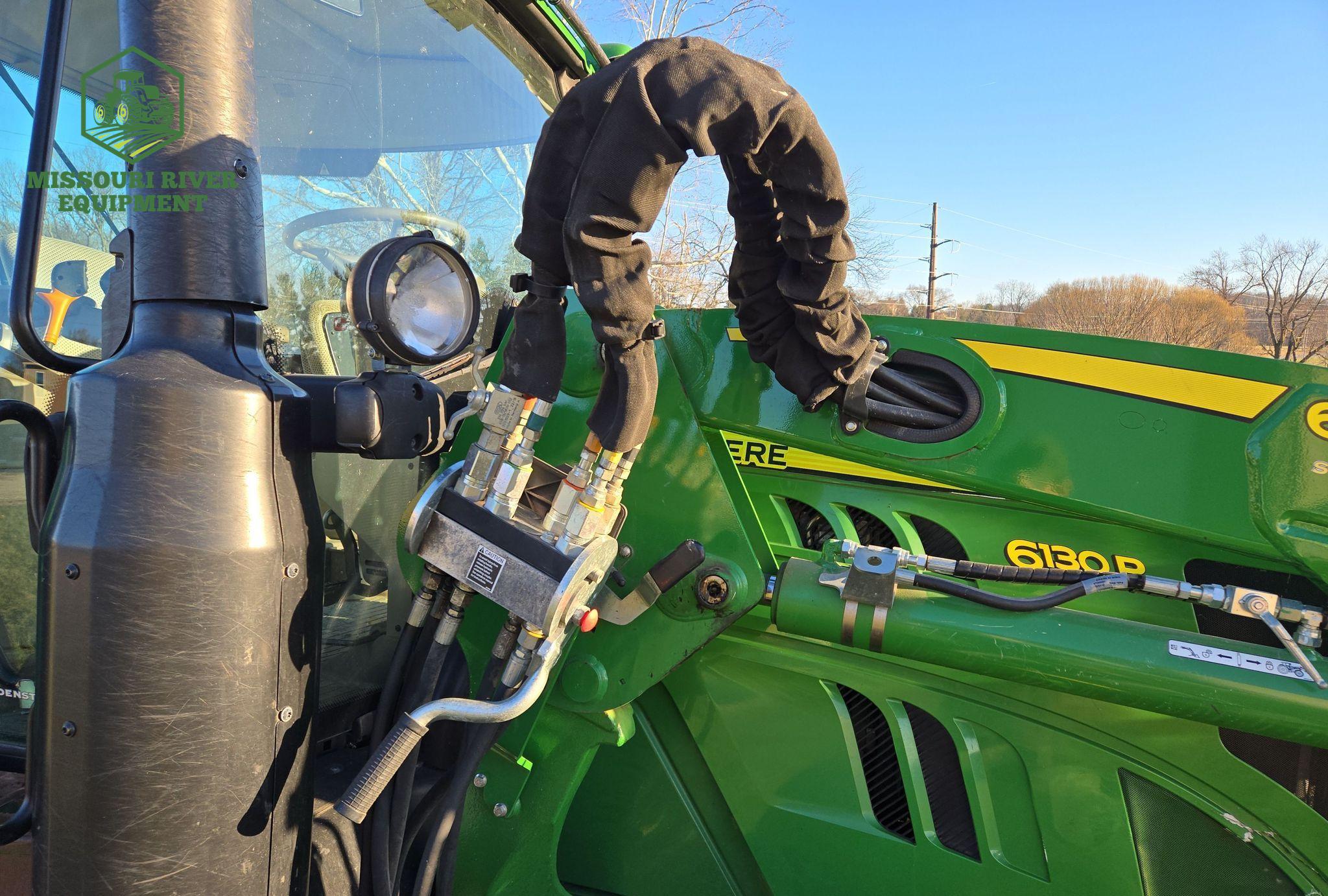 2017 John Deere 6130R MFWD tractor, 2,658 hours on meter. Powered by a John Deere 4.5L 4-Cylinder Diesel Engine (Serial: CD4045U054477) paired with powershift transmission (24 forward / 24 reverse) and differential lock. Operator station equipped with AC and heat. Features 1000 PTO, three-point hitch with top link, seven-pin outlet, and three rear hydraulic remote sets. Includes John Deere 620R quick attach loader with joystick controls and 85" bucket. Riding on 420/85R24 front and 460/85R38 rear tires. Three-point arms included.