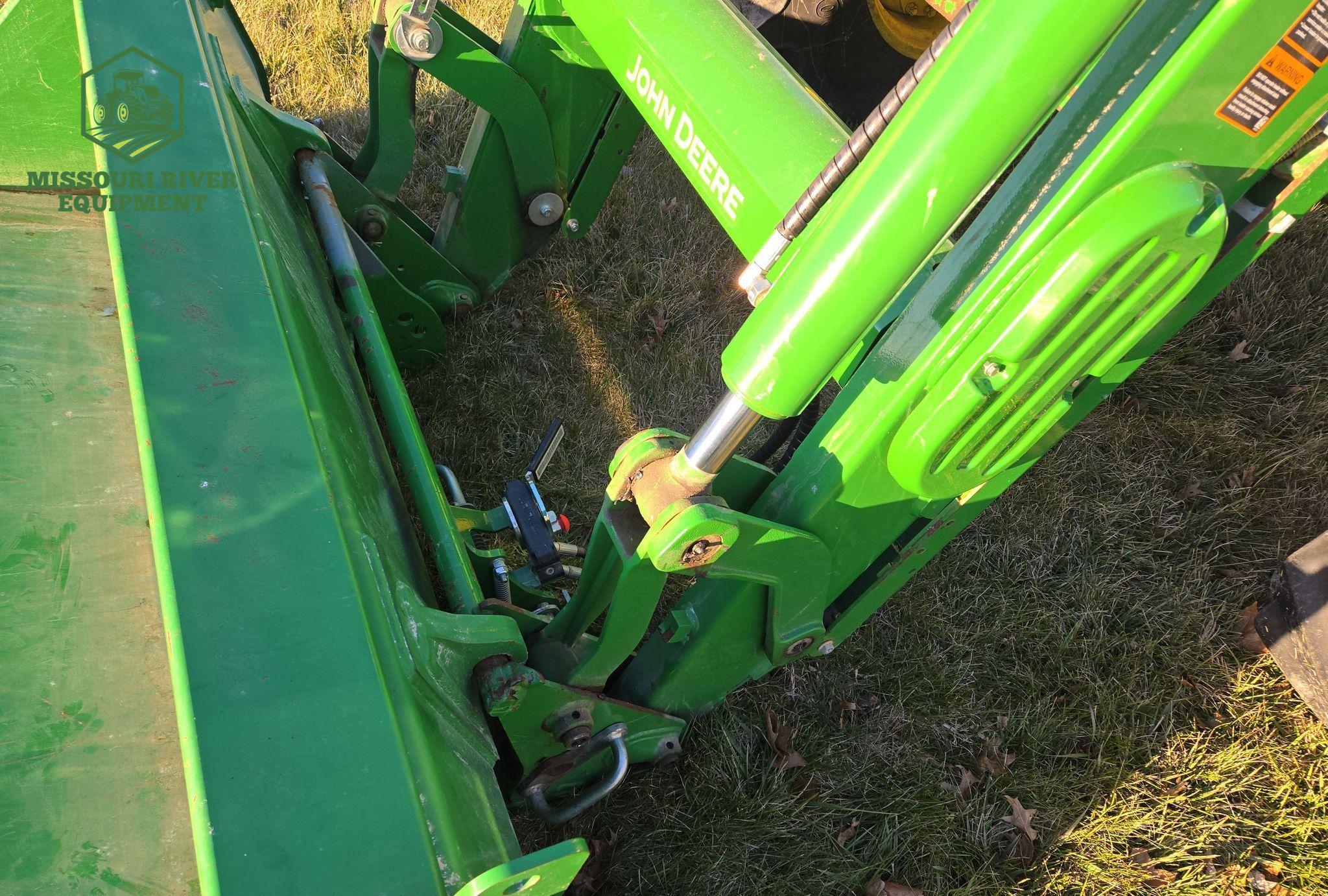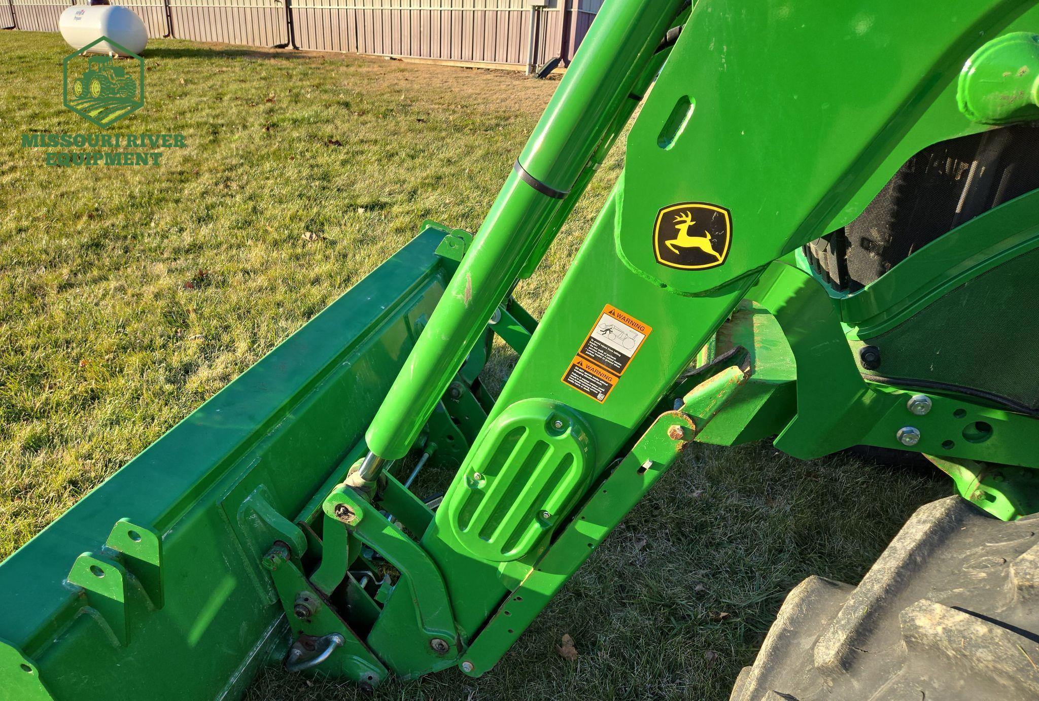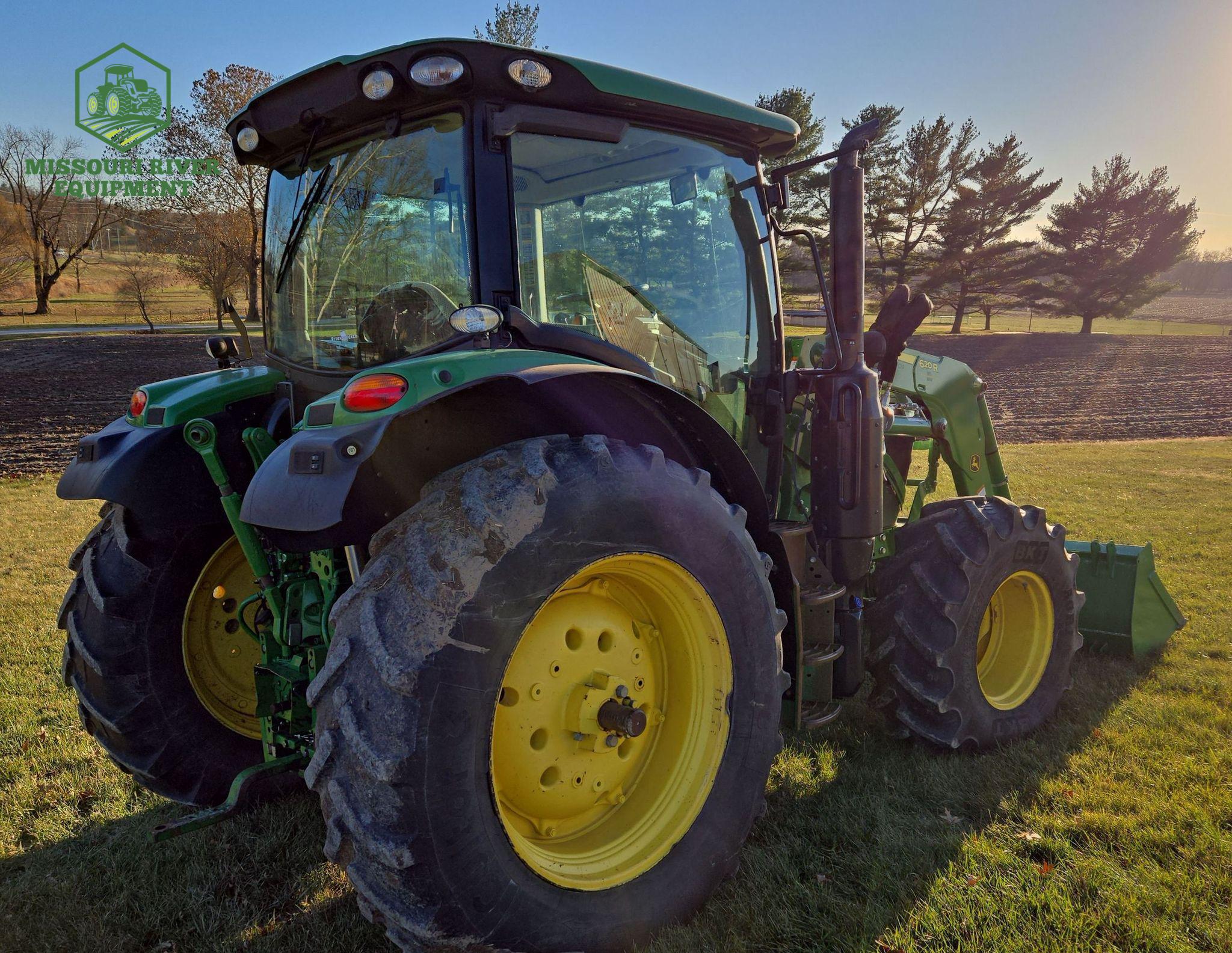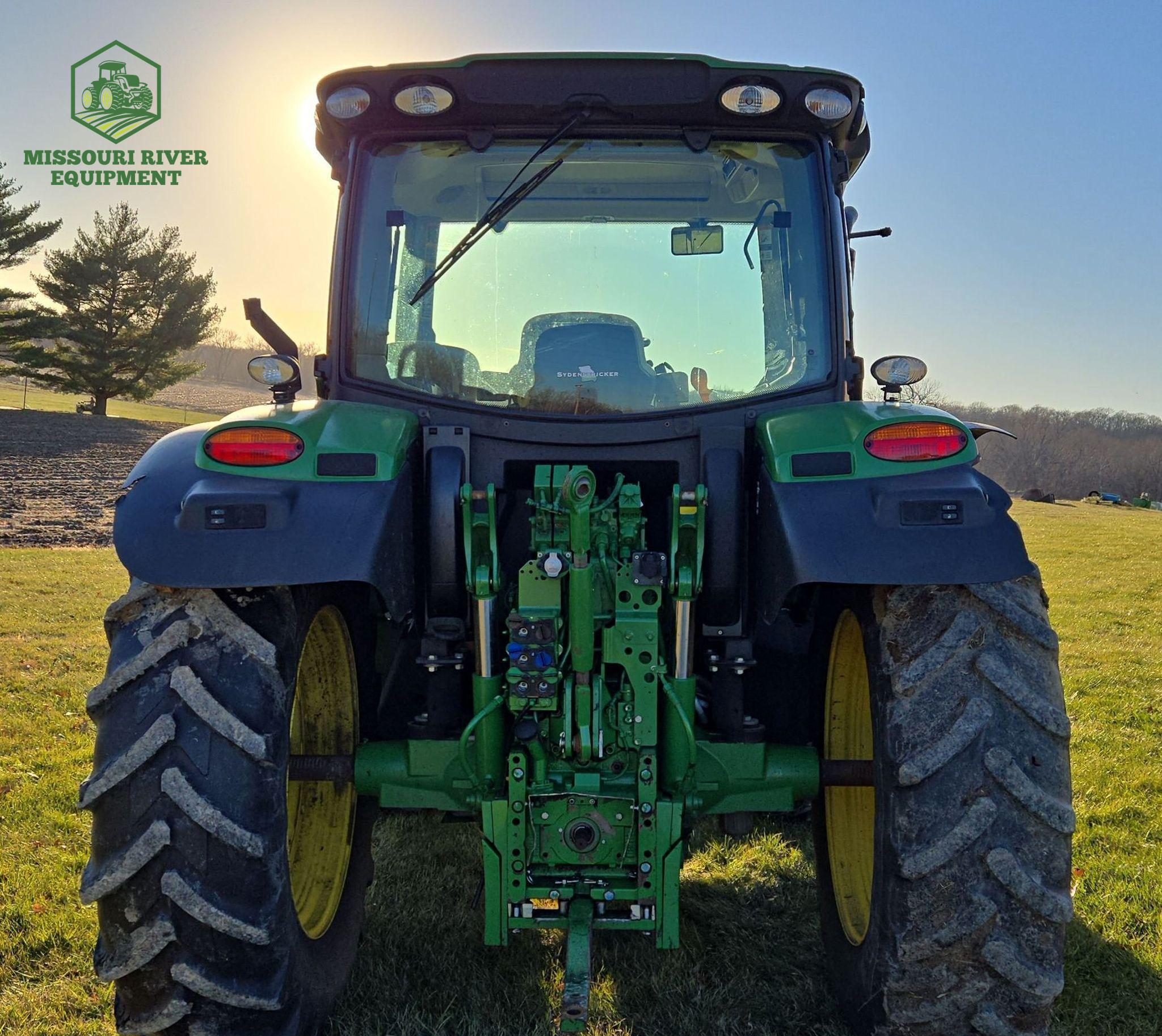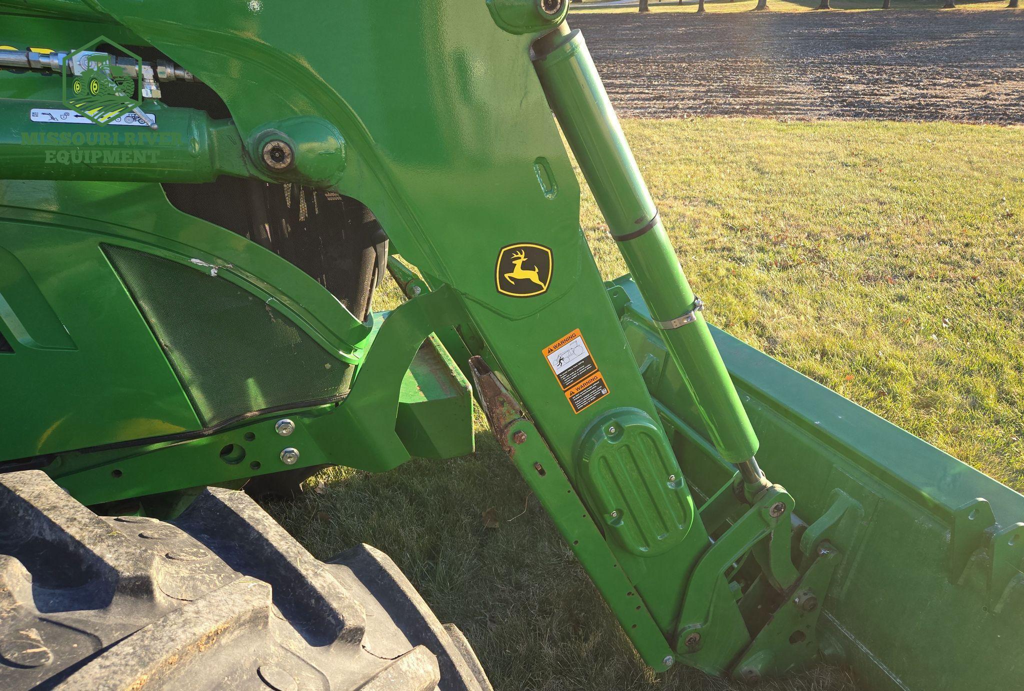 2017 John Deere 6130R MFWD tractor, 2,658 hours on meter. Powered by a John Deere 4.5L 4-Cylinder Diesel Engine (Serial: CD4045U054477) paired with powershift transmission (24 forward / 24 reverse) and differential lock. Operator station equipped with AC and heat. Features 1000 PTO, three-point hitch with top link, seven-pin outlet, and three rear hydraulic remote sets. Includes John Deere 620R quick attach loader with joystick controls and 85" bucket. Riding on 420/85R24 front and 460/85R38 rear tires. Three-point arms included.