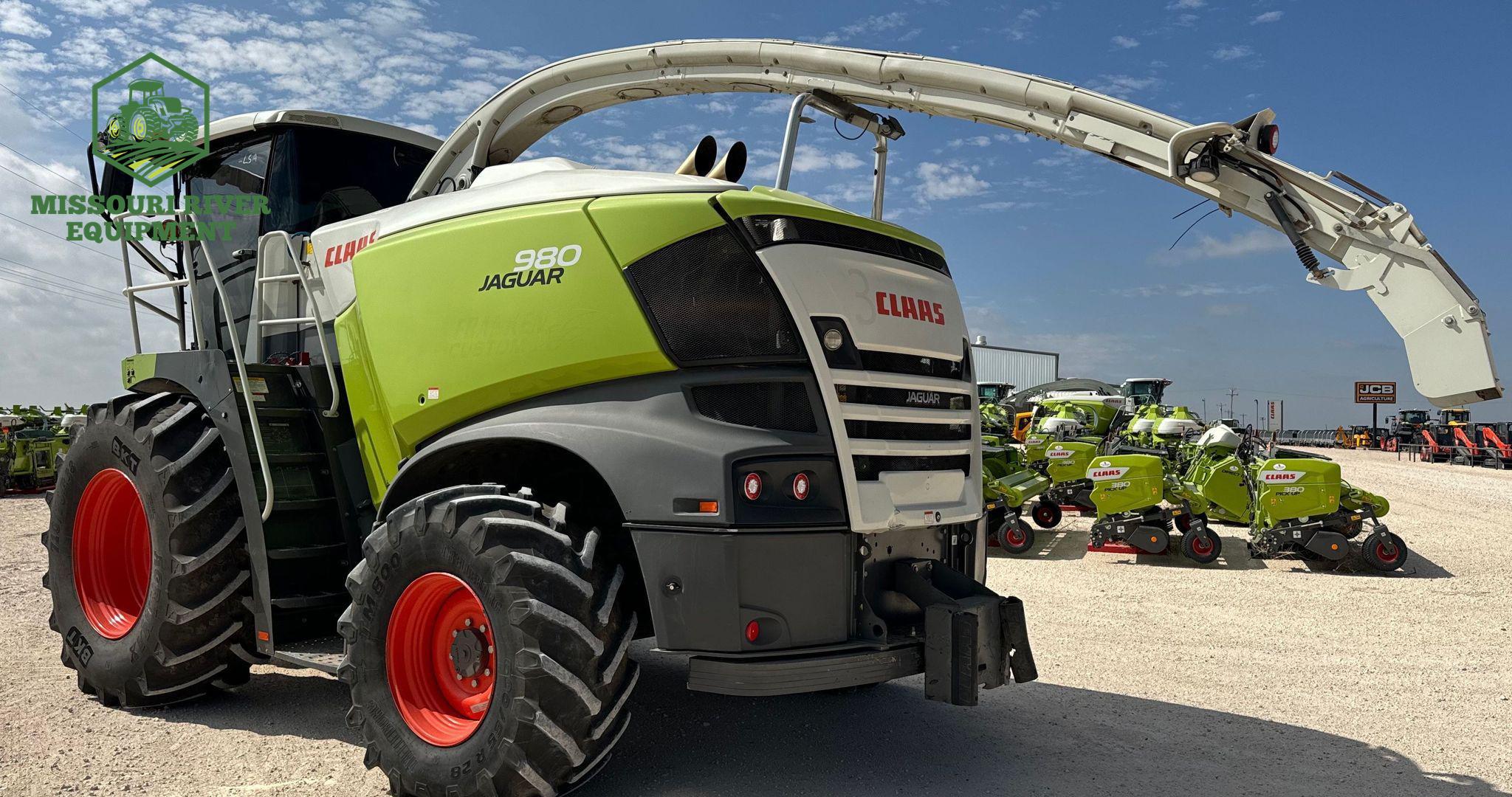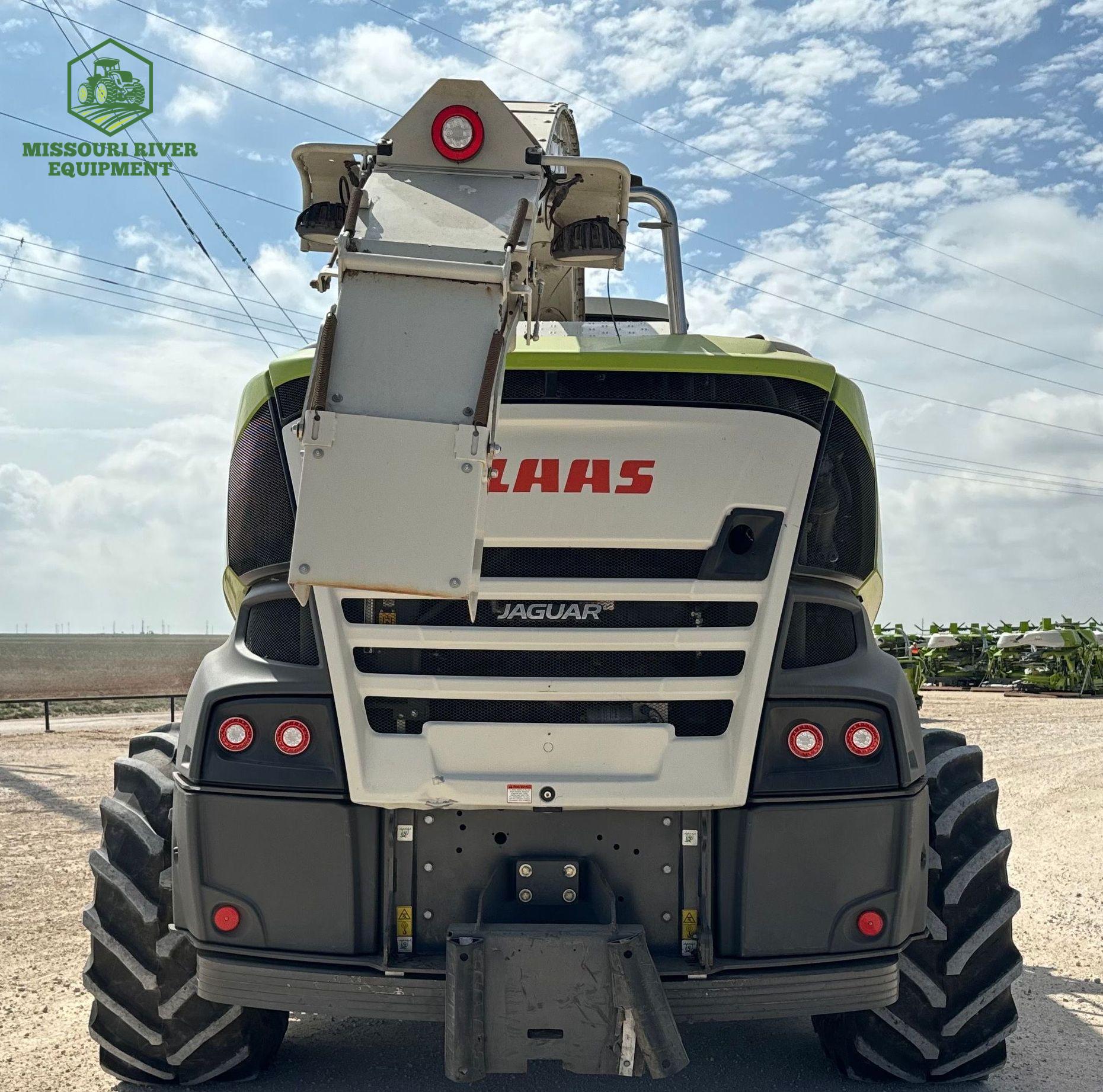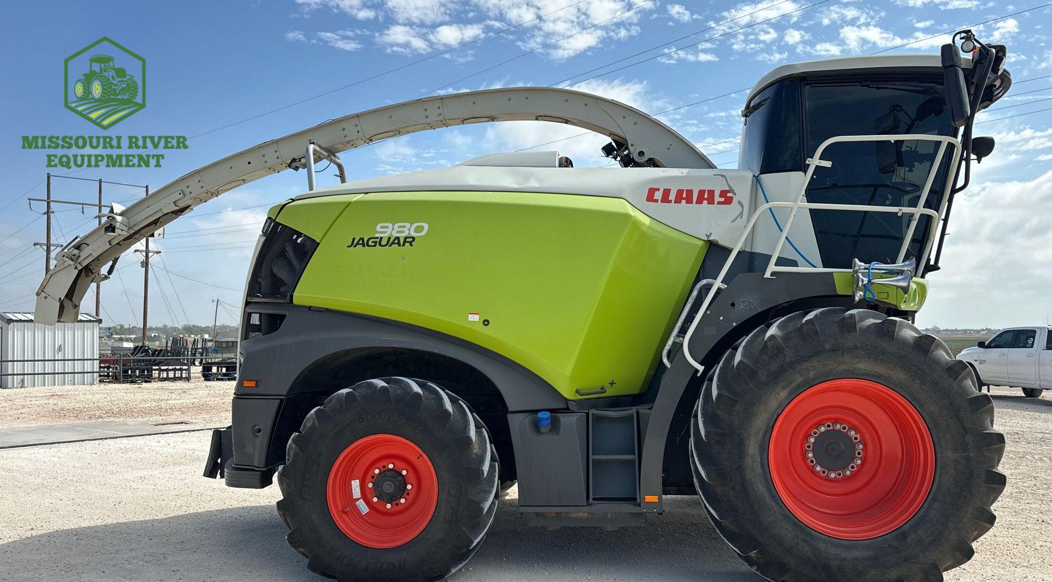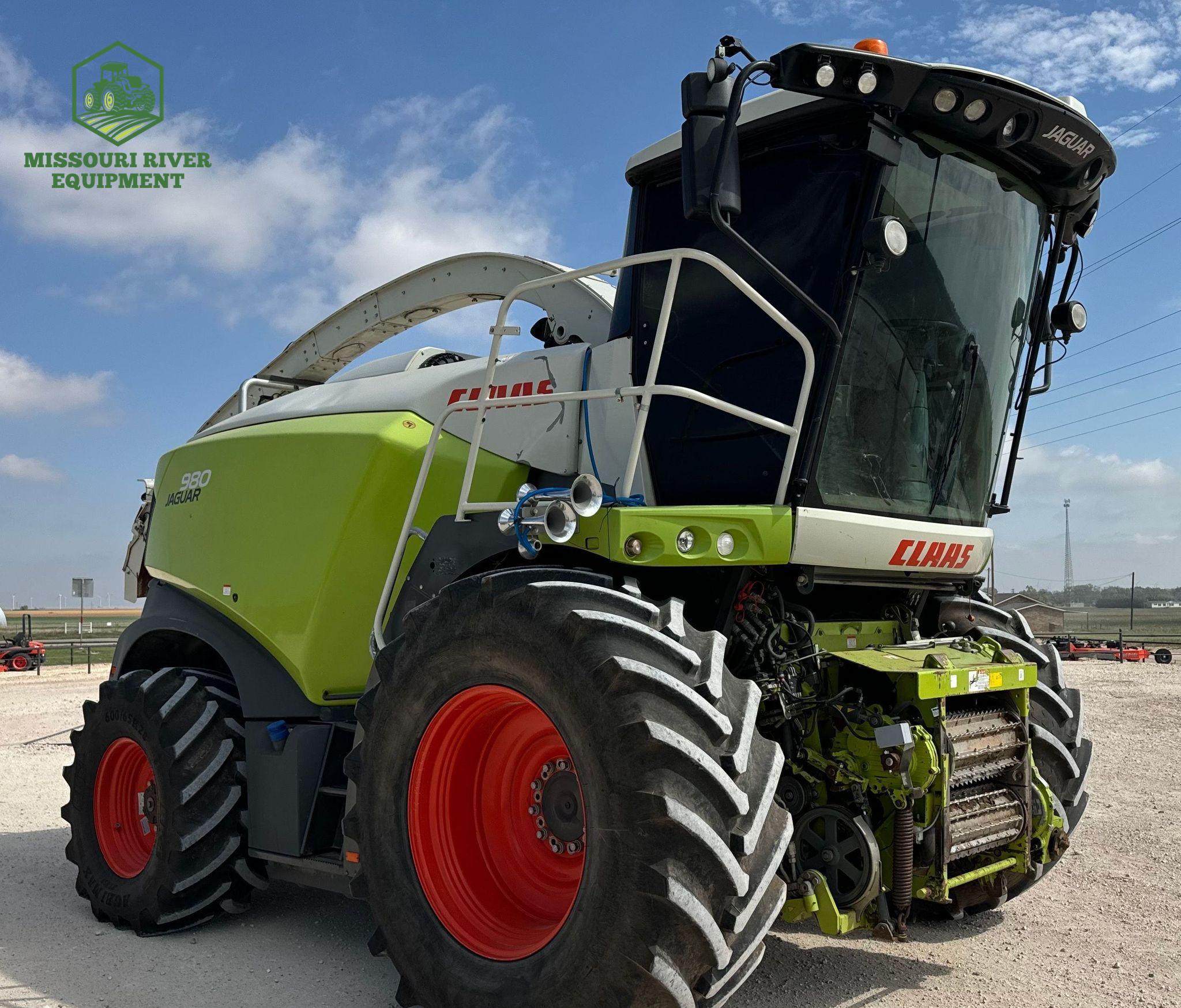 2018 Claas Jaguar 980 forage harvester with 4,107 engine hours and 3,007 cutter hours on meter. Powered by a MAN D2862LE133 24.2L 12-Cylinder Diesel Engine rated at 650 kW. Equipped with hydrostatic transmission and differential lock. Operator station includes AC, heat, and auto steer. Features auto lube system, on-board air, high-arch spout with hydraulic adjust, and single head drive. Riding on 710/70R38 front and 600/65R28 rear tires. Part of a group extension with related items DK6830 and DK6831.