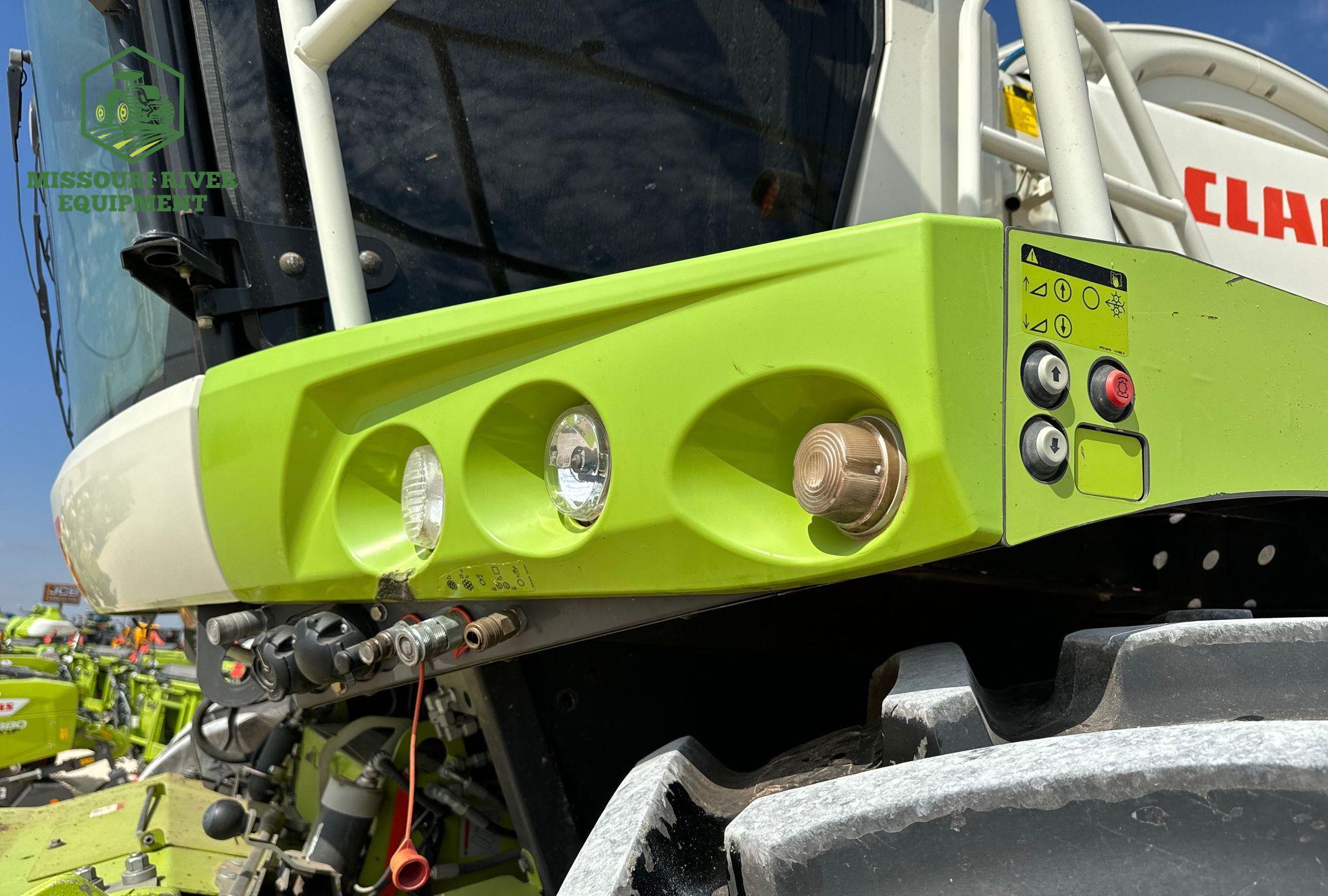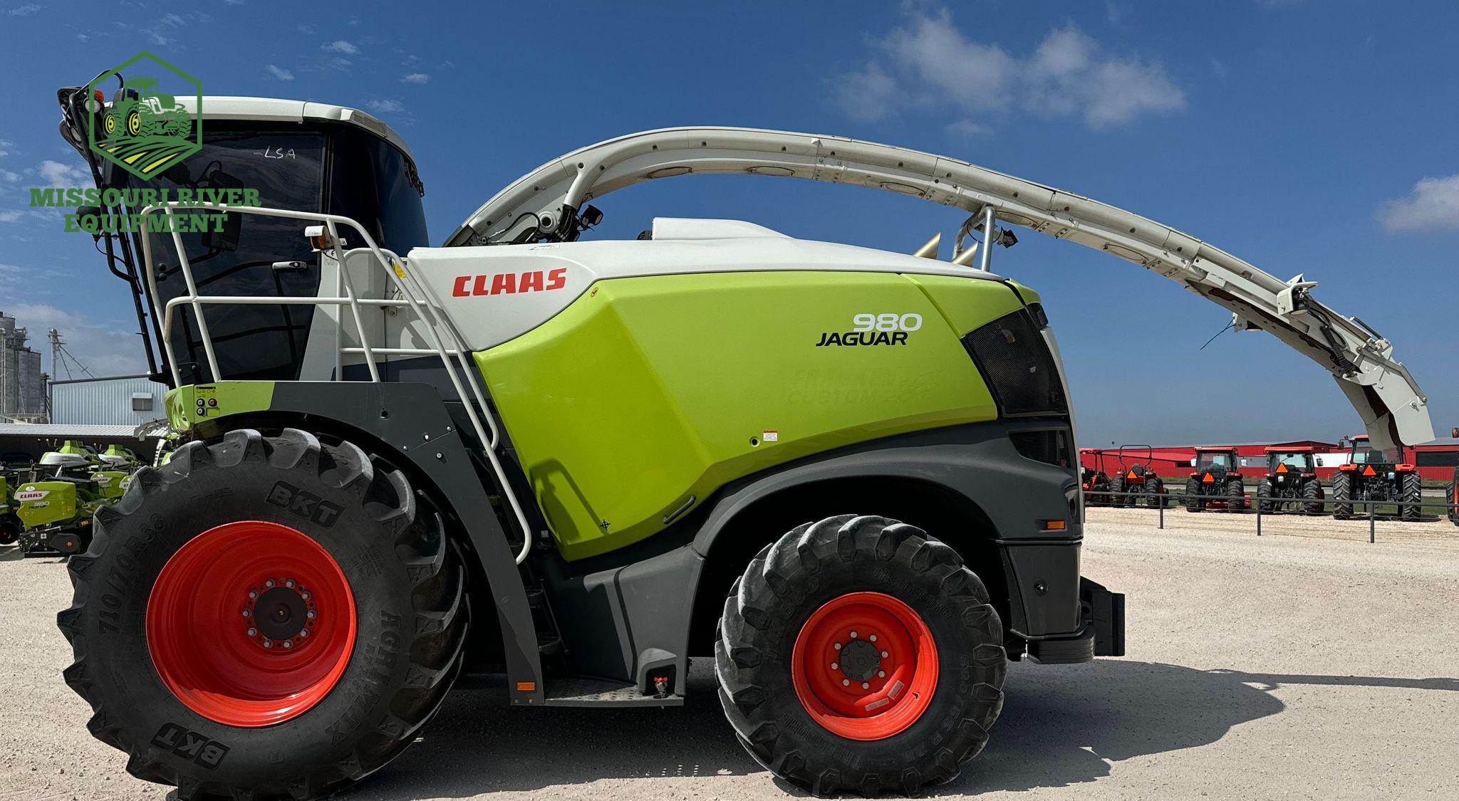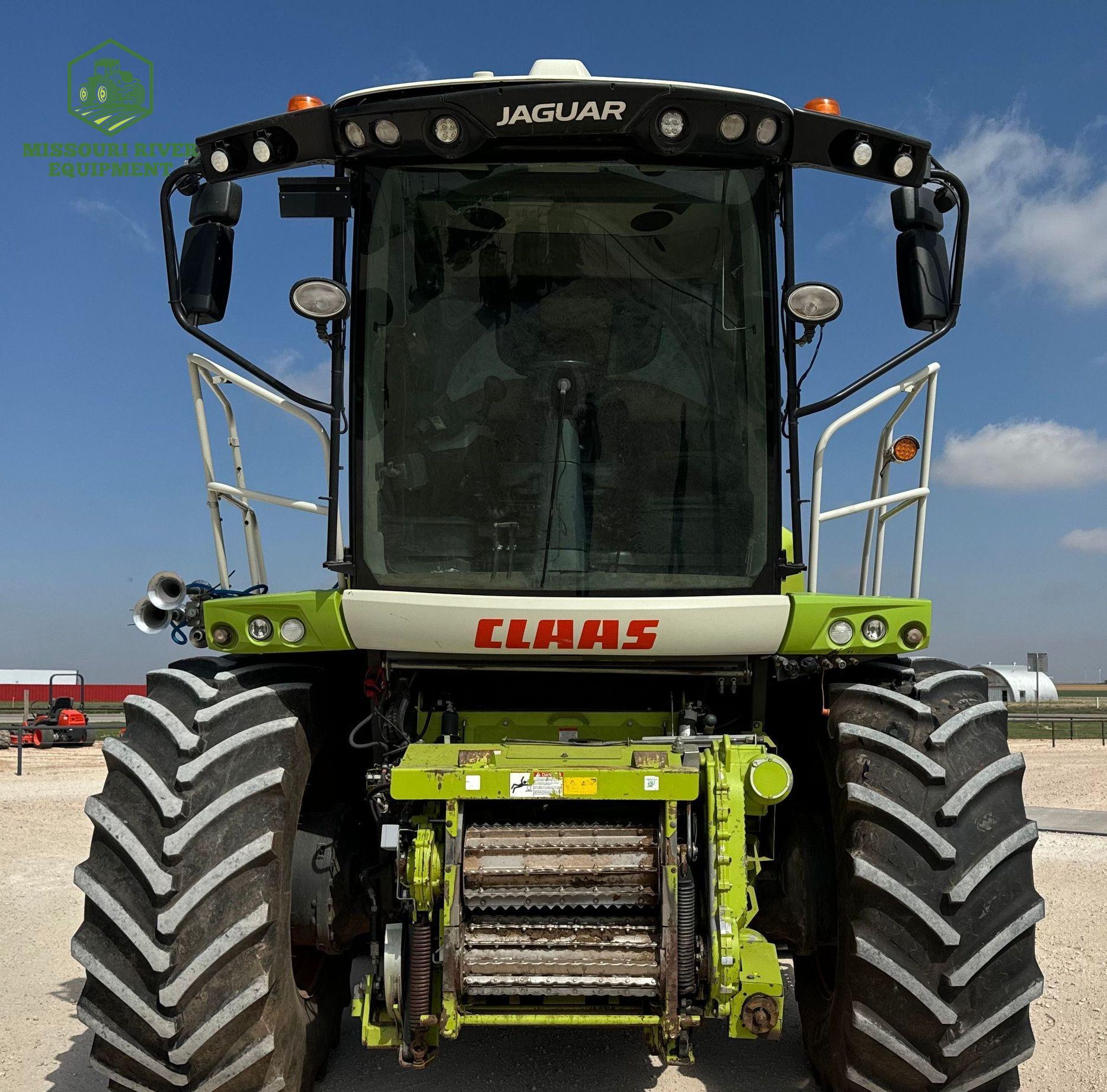 2018 Claas Jaguar 980 forage harvester with 4,107 engine hours and 3,007 cutter hours on meter. Powered by a MAN D2862LE133 24.2L 12-Cylinder Diesel Engine rated at 650 kW. Equipped with hydrostatic transmission and differential lock. Operator station includes AC, heat, and auto steer. Features auto lube system, on-board air, high-arch spout with hydraulic adjust, and single head drive. Riding on 710/70R38 front and 600/65R28 rear tires. Part of a group extension with related items DK6830 and DK6831.