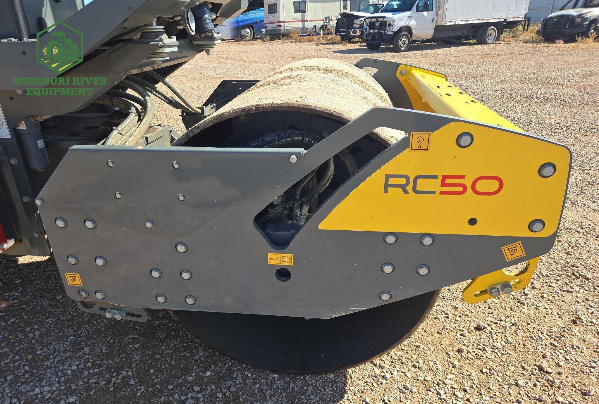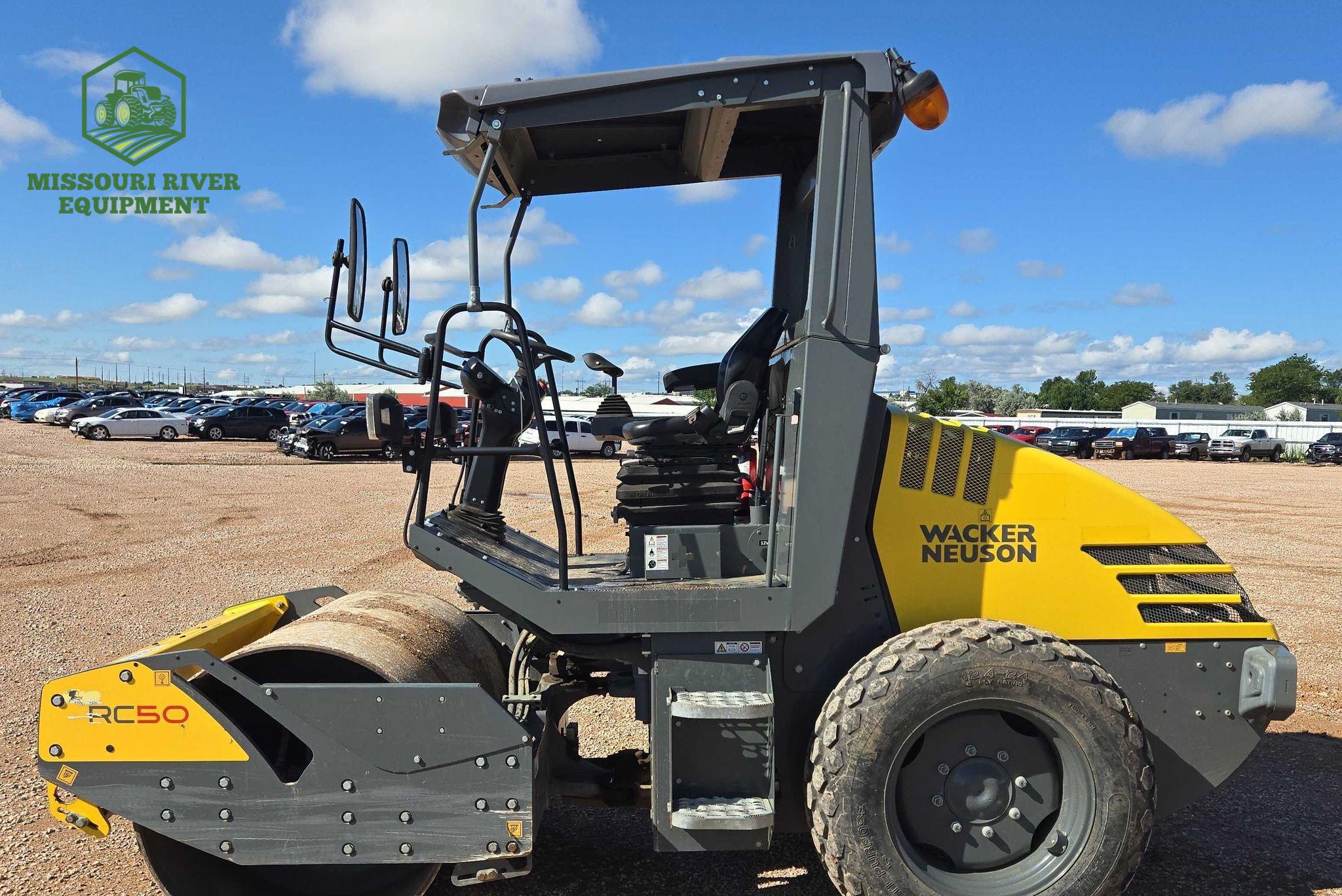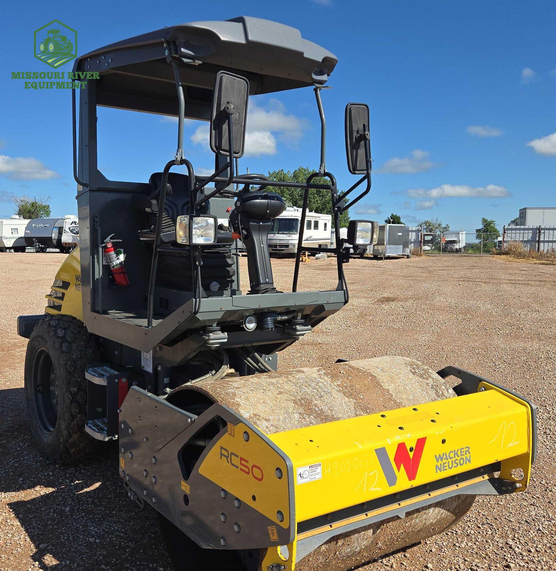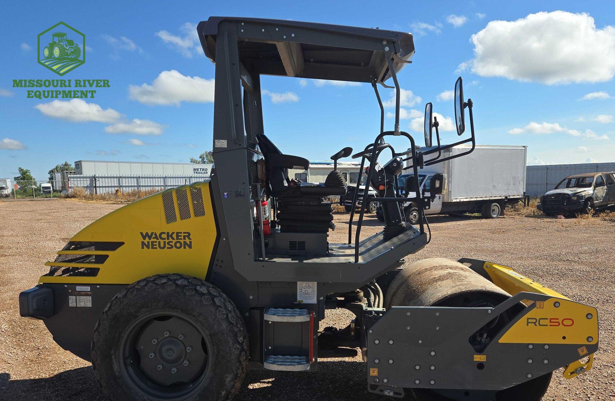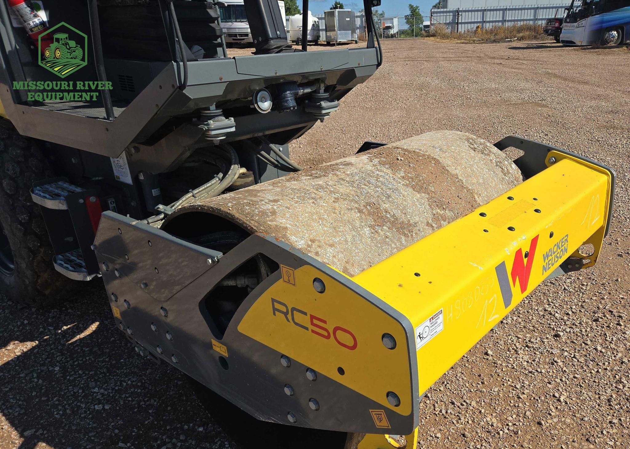 2021 Wacker Neuson RC50 single drum vibratory roller, 461 hours on meter. Powered by a Kubota V3307-CR-T-EW04 3.3L 4-Cylinder Diesel Engine with hydrostatic drive and two-speed travel. Operator station is OROPS. Drum is 54" smooth with single vibratory system (two-speed) and 39" diameter, equipped with drum scrapers. Tire size 12.4-24. Notes: vandal cover missing; unit required a jump start during on-site data collection. Fleet inventory reduction-stored at a secured facility. Please review REQUIRED REMOVAL INSTRUCTIONS.