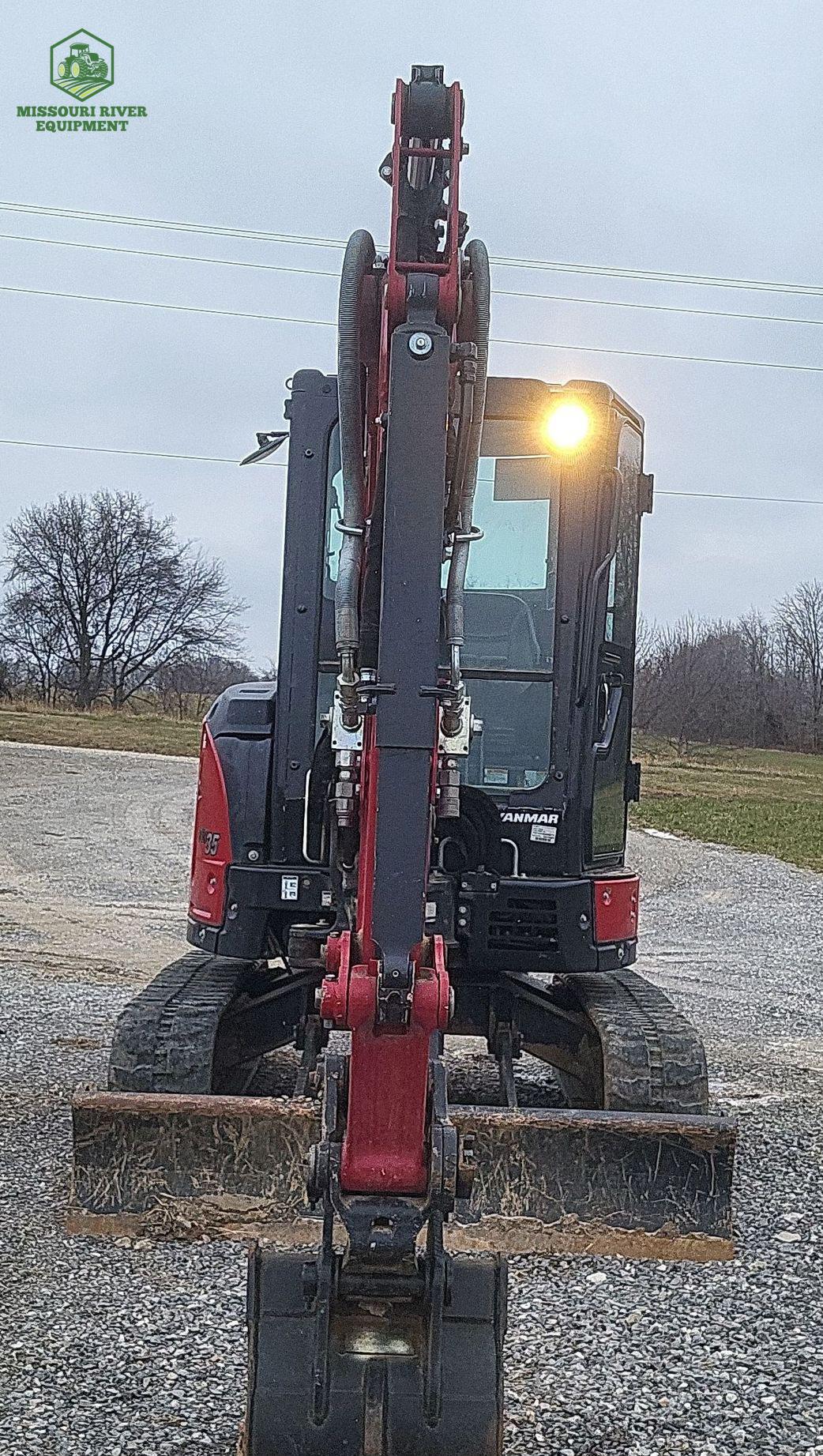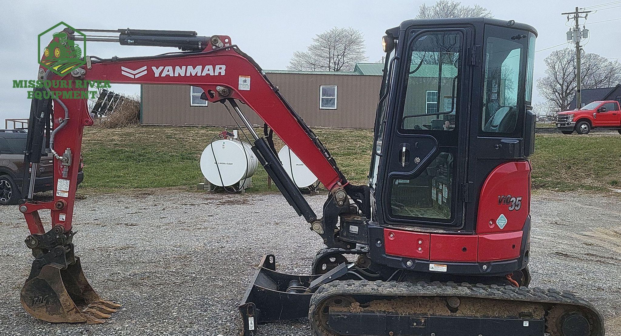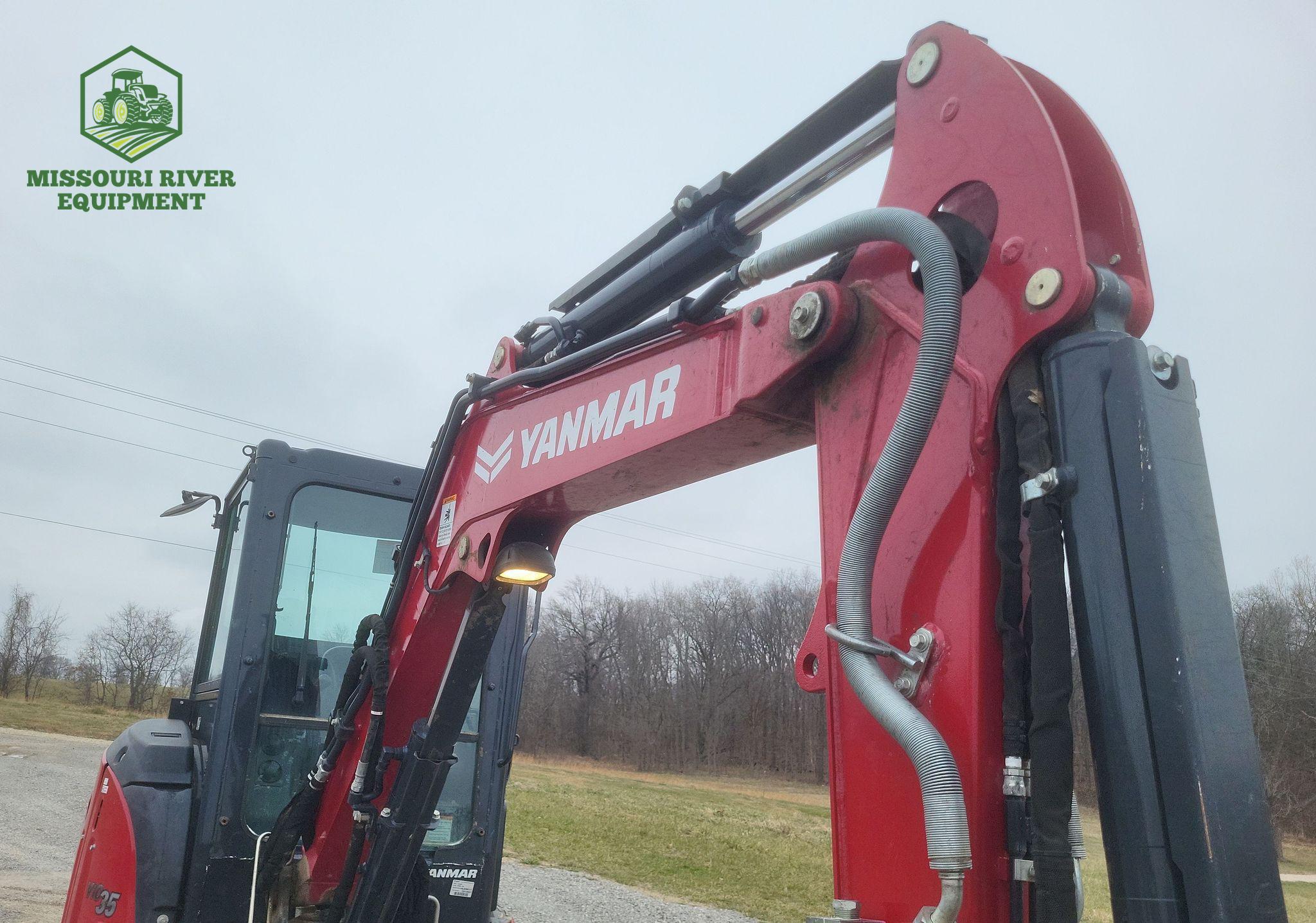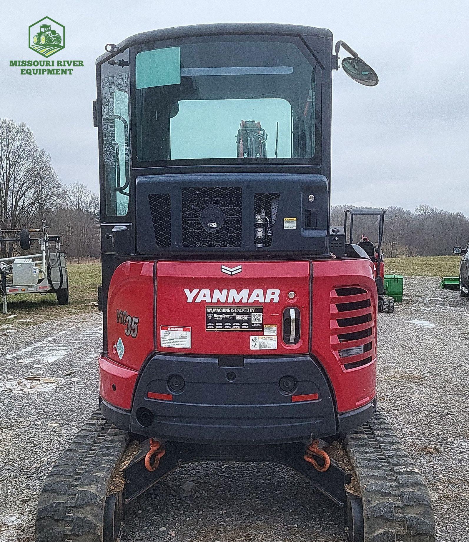 2021 Yanmar ViO35 mini excavator, 939.9 hours on meter. Equipped with a Yanmar 4HNSAE 1.642L Diesel Engine and Hydrostatic Transmission with Two-Speed Travel. Operator station features enclosed cab with AC and heat. Includes auxiliary hydraulics, counterweights, 68" backfill blade, swing boom, 4' 7" stick, and Yanmar hydraulic quick coupler. Comes with 18" TAG bucket with weld-on cutting edge and 4 teeth. Riding on 12" rubber tracks.