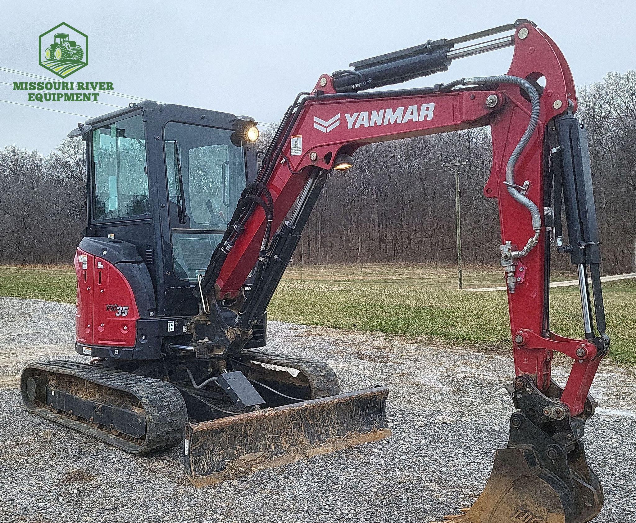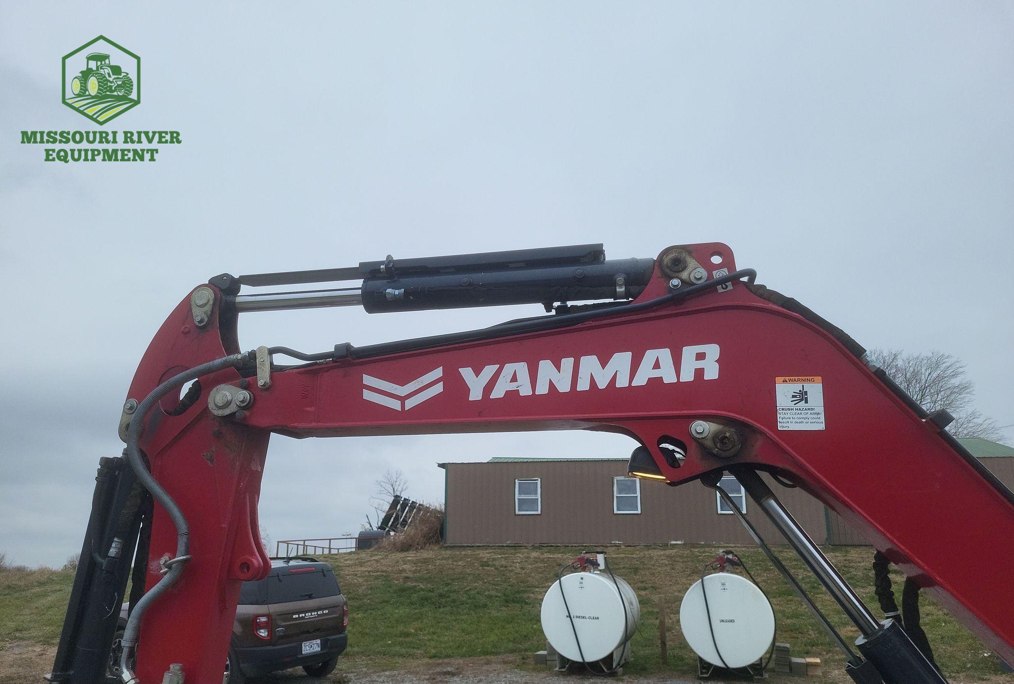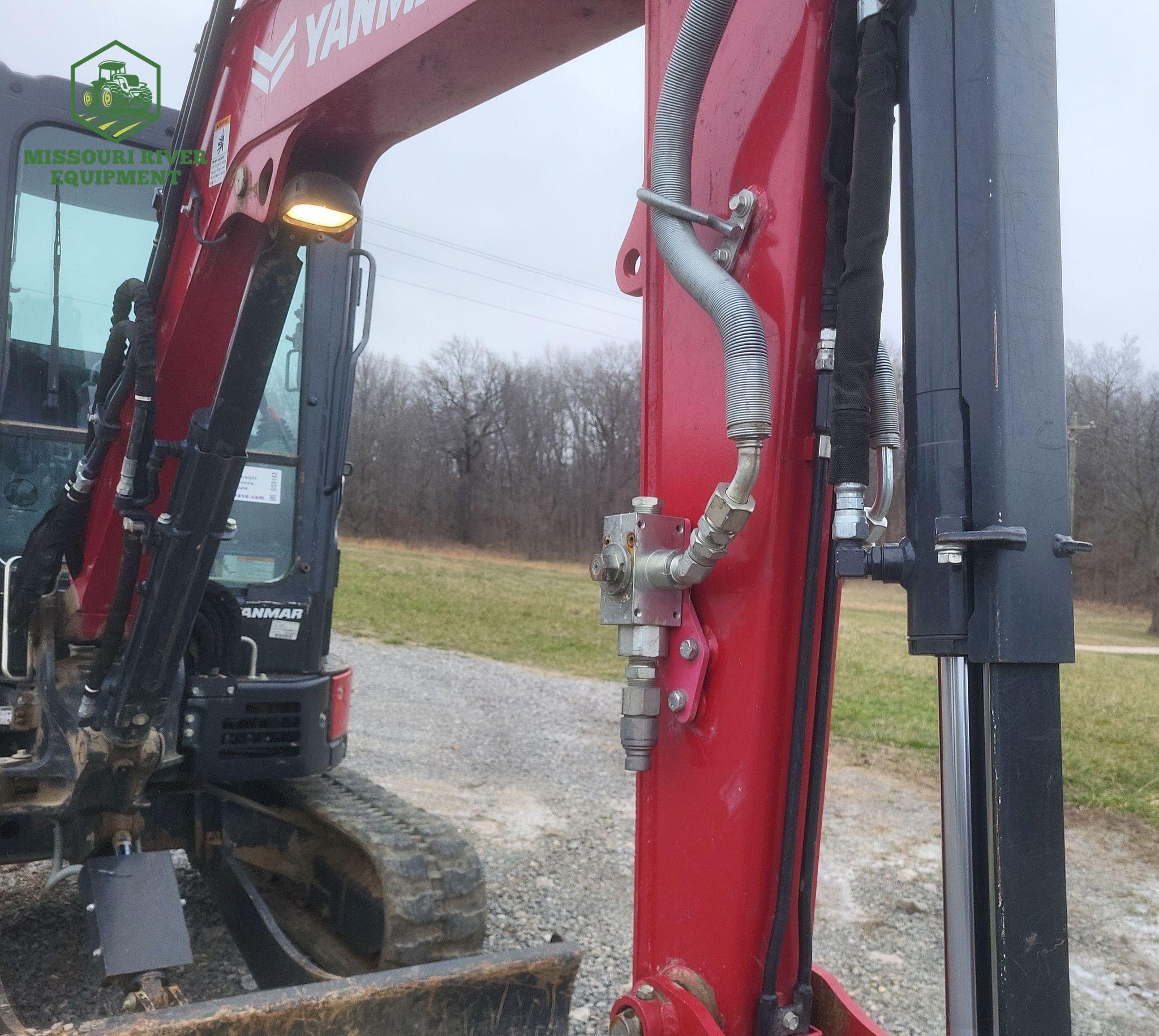 2021 Yanmar ViO35 mini excavator, 939.9 hours on meter. Equipped with a Yanmar 4HNSAE 1.642L Diesel Engine and Hydrostatic Transmission with Two-Speed Travel. Operator station features enclosed cab with AC and heat. Includes auxiliary hydraulics, counterweights, 68" backfill blade, swing boom, 4' 7" stick, and Yanmar hydraulic quick coupler. Comes with 18" TAG bucket with weld-on cutting edge and 4 teeth. Riding on 12" rubber tracks.